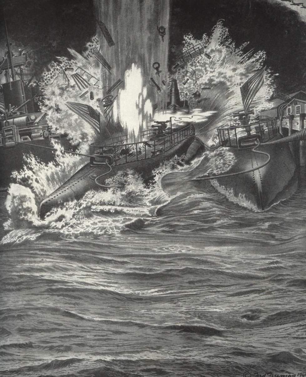 ![]() | 214k | Direct hit! Two bombs strike Sealion (SS-195) almost simultaneously. First U.S. submarine casualty of the war, she went down in the shambles of Cavite - was later raised from the shallows off Machina wharf and sunk in Manila Bay to prevent capture. Seadragon (SS-194) (shown at right) narrowly escaped the blast. | Drawing by Lt. Cmdr. Fred Freemen, Courtesy of Theodore Roscoe, from his book "U.S. Submarine Operations of WW II", published by USNI. | |