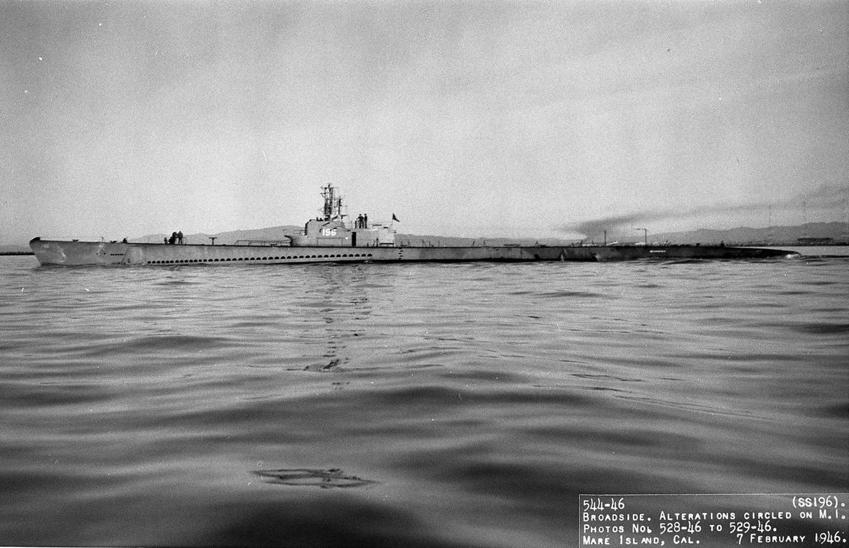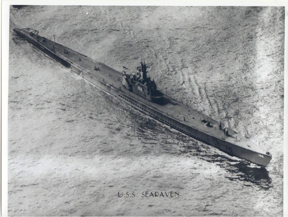 103k | Searaven (SS-196) underway, 11 March 1946. In another three months she would be one of the target ships in the 1946 atomic bomb test Operation Crossroads at Bikini Atoll. She escaped the tests with only negligible damage. | Text courtesy of DANFS. Photo courtesy of John Hummel, USN (Retired). | |