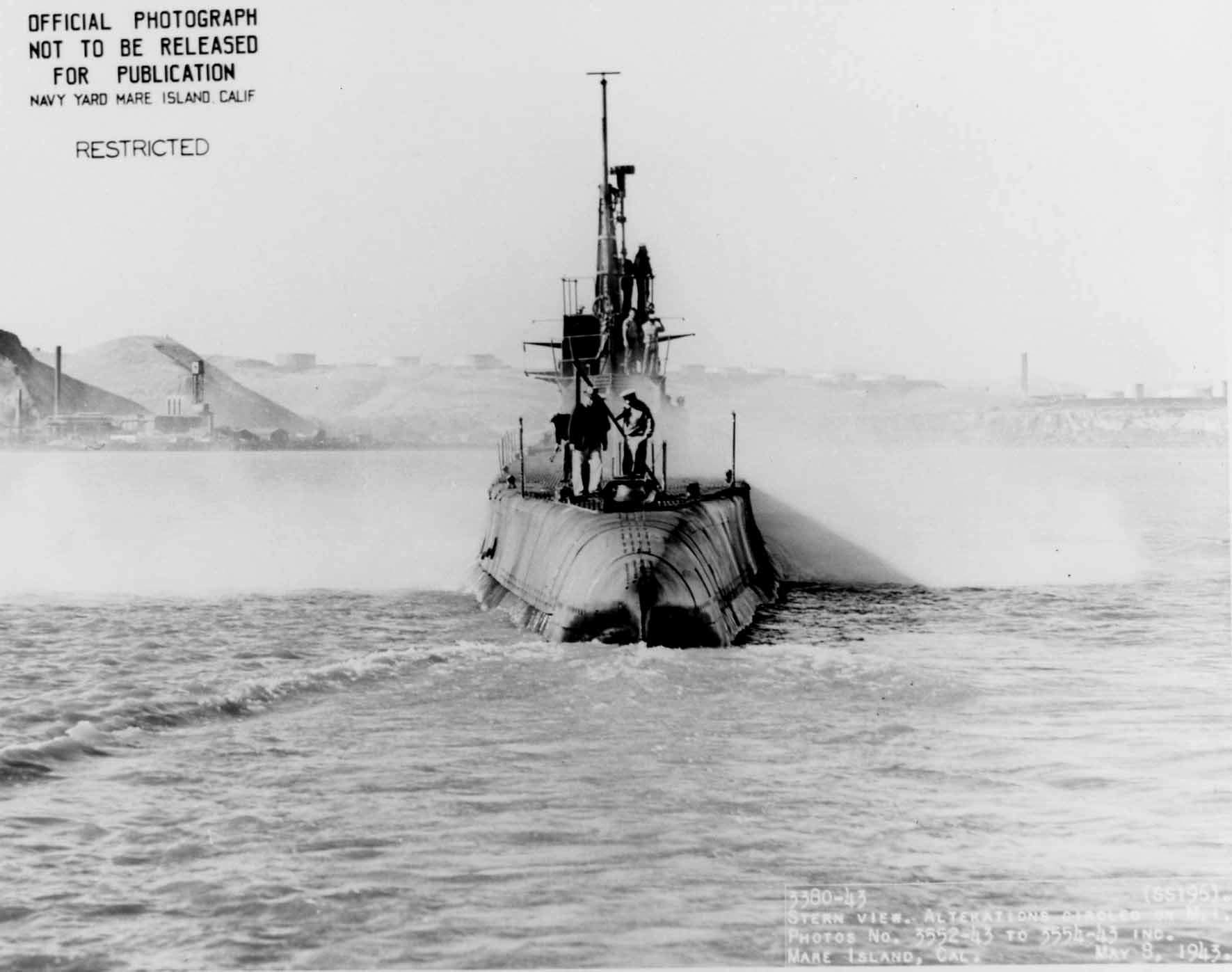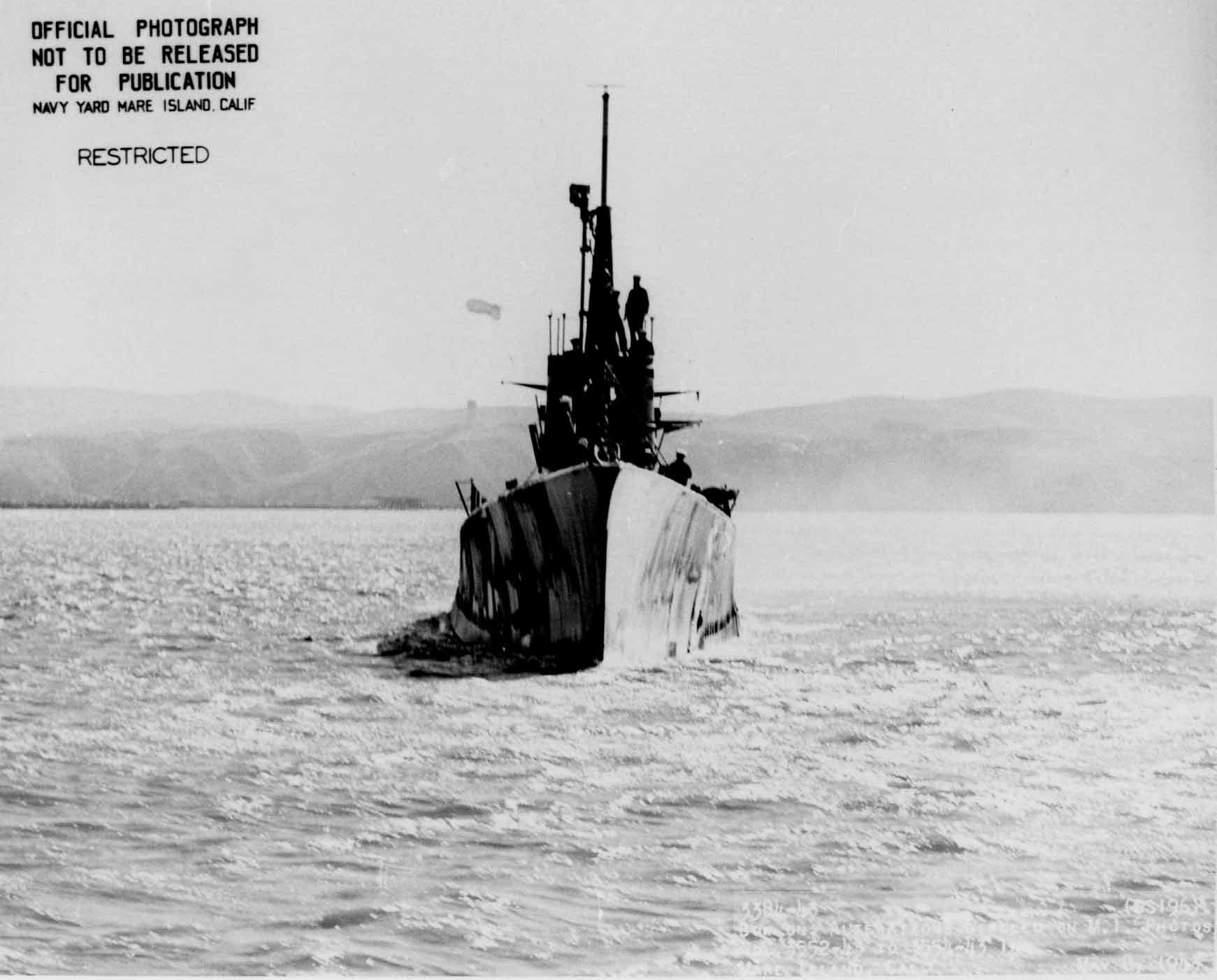 112k | Stern view of Searaven (SS-196) departing Mare Island on 8 May 1943. She was in overhaul at the yard from 19 February to 18 May 1943. | USN photo # 3380-43, courtesy of Darryl L. Baker. | |