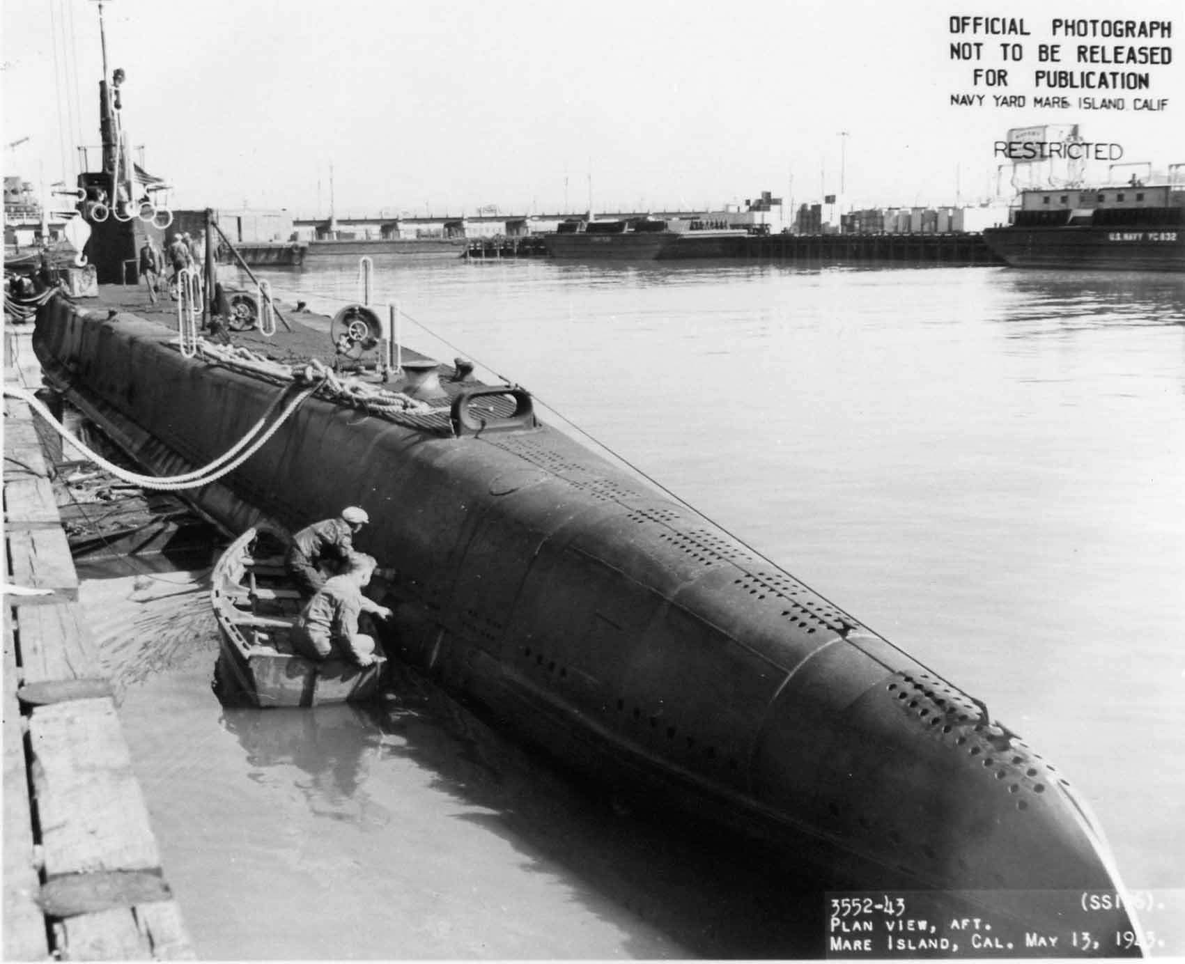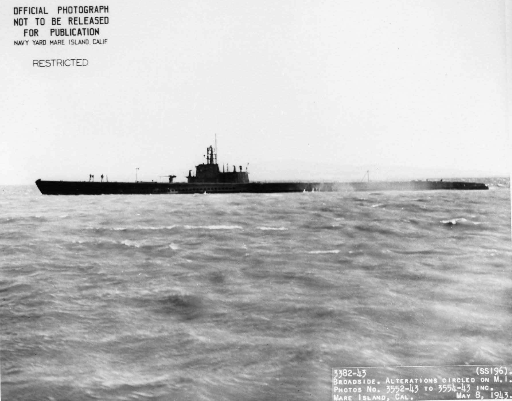 112k | Broadside view of Searaven (SS-196) off Mare Island on 8 May 1943. She was in overhaul at the yard from 19 February to 18 May 1943. | USN photo # 3382-43, courtesy of Darryl L. Baker. | |
