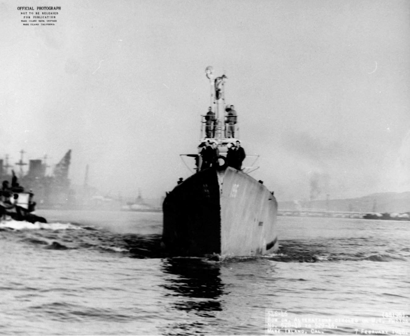371k | Bow on view of Searaven (SS-196) departing Mare Island on 7 February 1946. | USN photo # 546-46, courtesy of Darryl L. Baker. | |