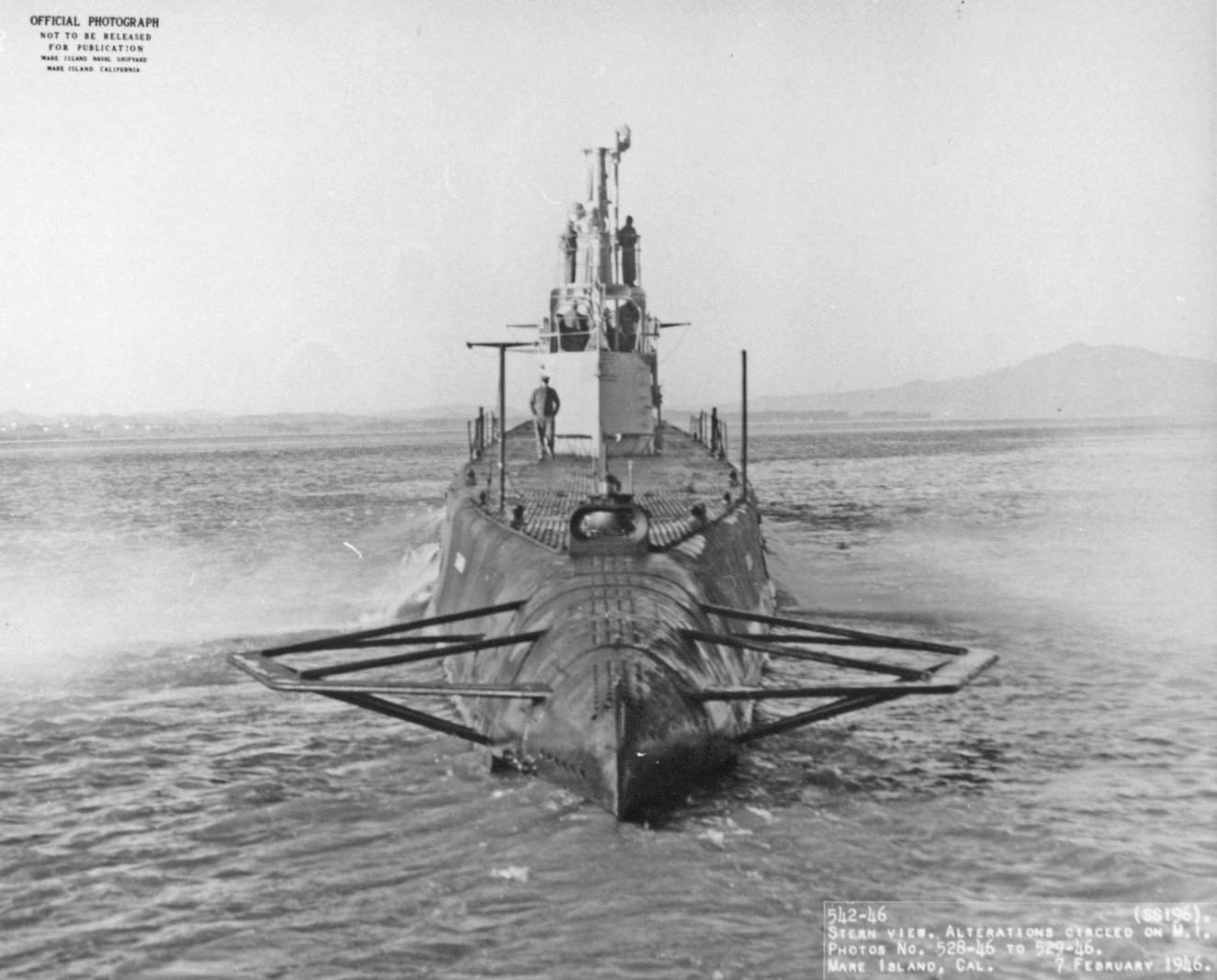 422k | Stern view of Searaven (SS-196) off Mare Island on 7 February 1946. | USN photo # 542-46, courtesy of Darryl L. Baker. | |