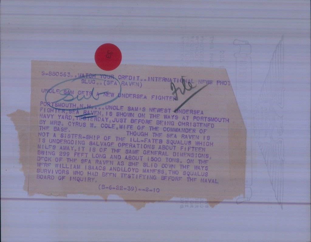 589k | Searaven (SS-196) having her finishing touches at the Portsmouth Navy Yard, 1 July 1939. | A.P. Wire courtesy of Tommy Trampp. | |