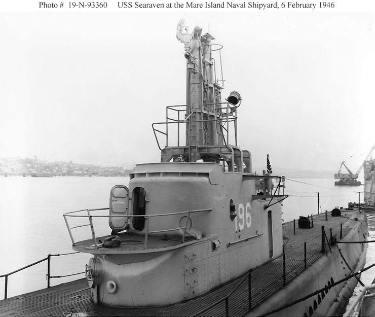 46k | Plan view, amidships looking aft, showing details of the Searaven's (SS-196) fairwater. Taken at the Mare Island Naval Shipyard, California, 6 February 1946. Note that her deck guns have been removed. | Photograph # 19-N-93360, from the Bureau of Ships Collection in the U.S. National Archives. | |