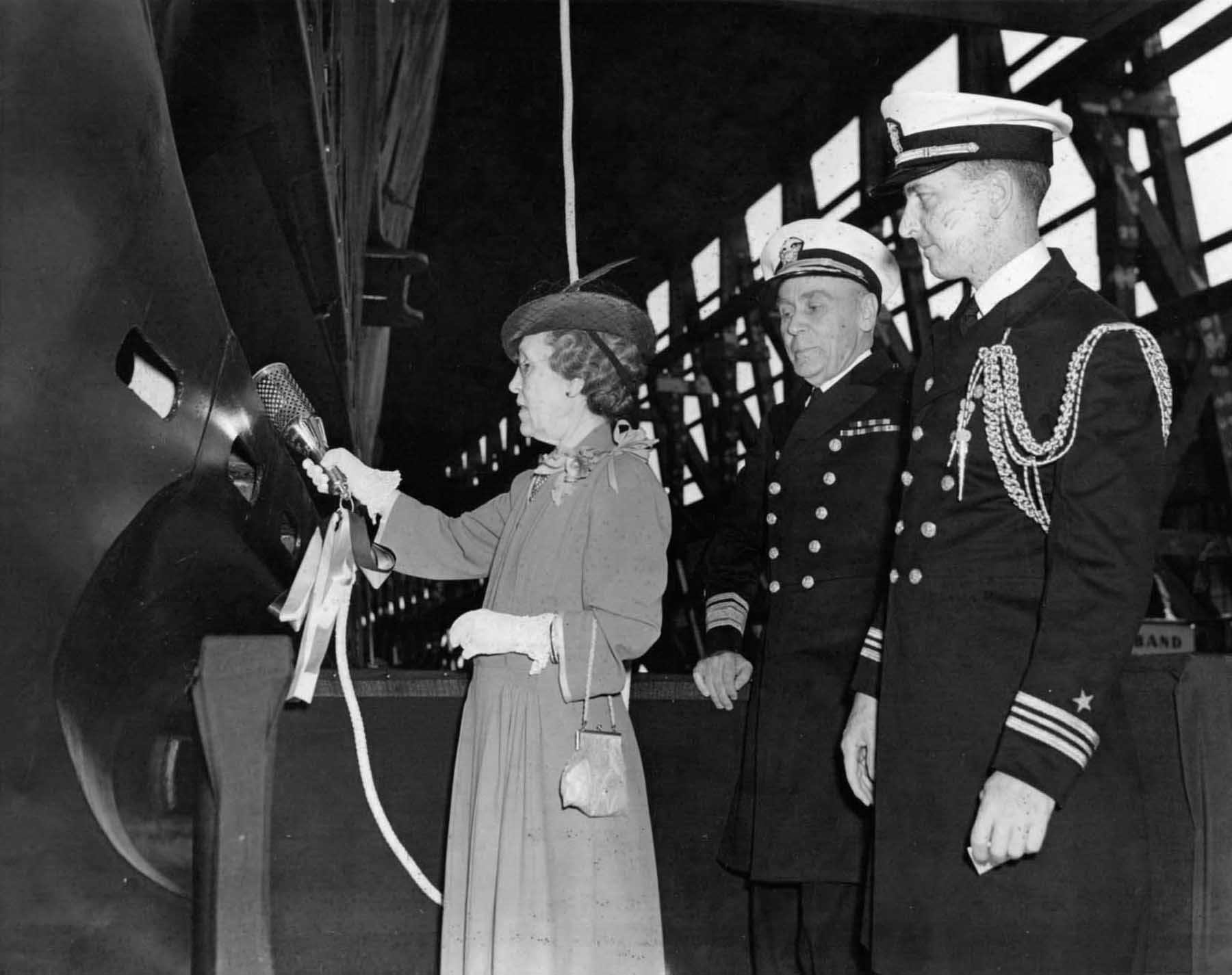 137k | Mrs. Cyrus W. Cole as she prepares to christen the Searaven (SS-196). Her husband, Cyrus Willard Cole, commandant of Portsmouth Navy Yard, stands behind her. Their son, Cyrus C. Cole, stands next to his father. | USN photo courtesy of Dale Hargrave. | |