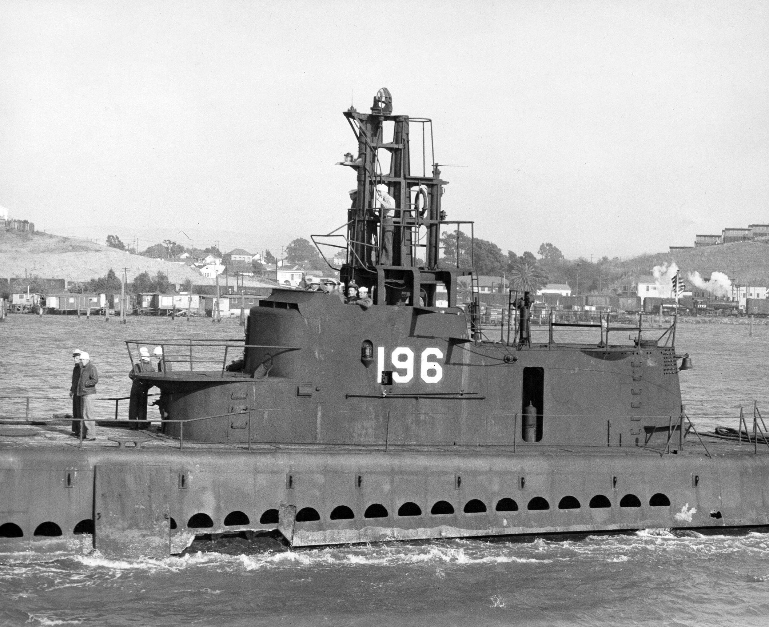 1.20k | Searaven (SS-196) in the Mare Island Channel on 14 October 1946. Note the damage to the superstructure plating but the Operation Crossroad "Baker" test damage reports states that this damage was not due to the test blast but due to bad corrosion problems plaguing the submarine. | USN photo # 36x1-10-46 TH, from the Vallejo Naval & Historical Museum courtesy of Darryl L. Baker. | |