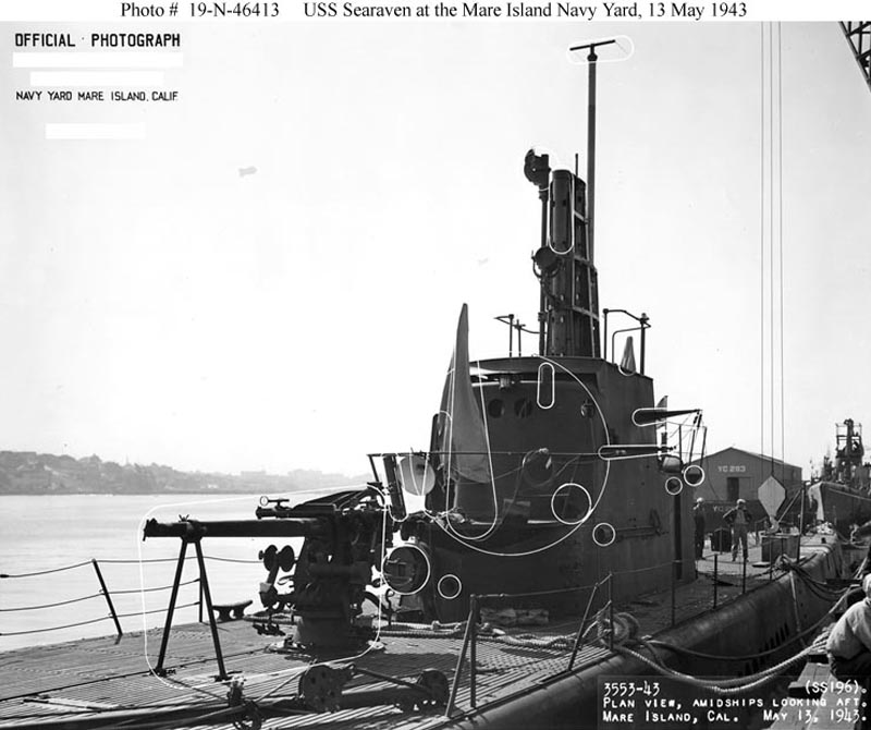 124k | Stern plan view of Searaven (SS-196) at Mare Island Navy Yard on 13 May 1943. She was in overhaul at the yard from 19 February to 18 May 1943. Circled areas indicate modifications made during the overhaul. Workers are painting the hull. | USN photo # 3552-43, courtesy of Darryl L. Baker. | |