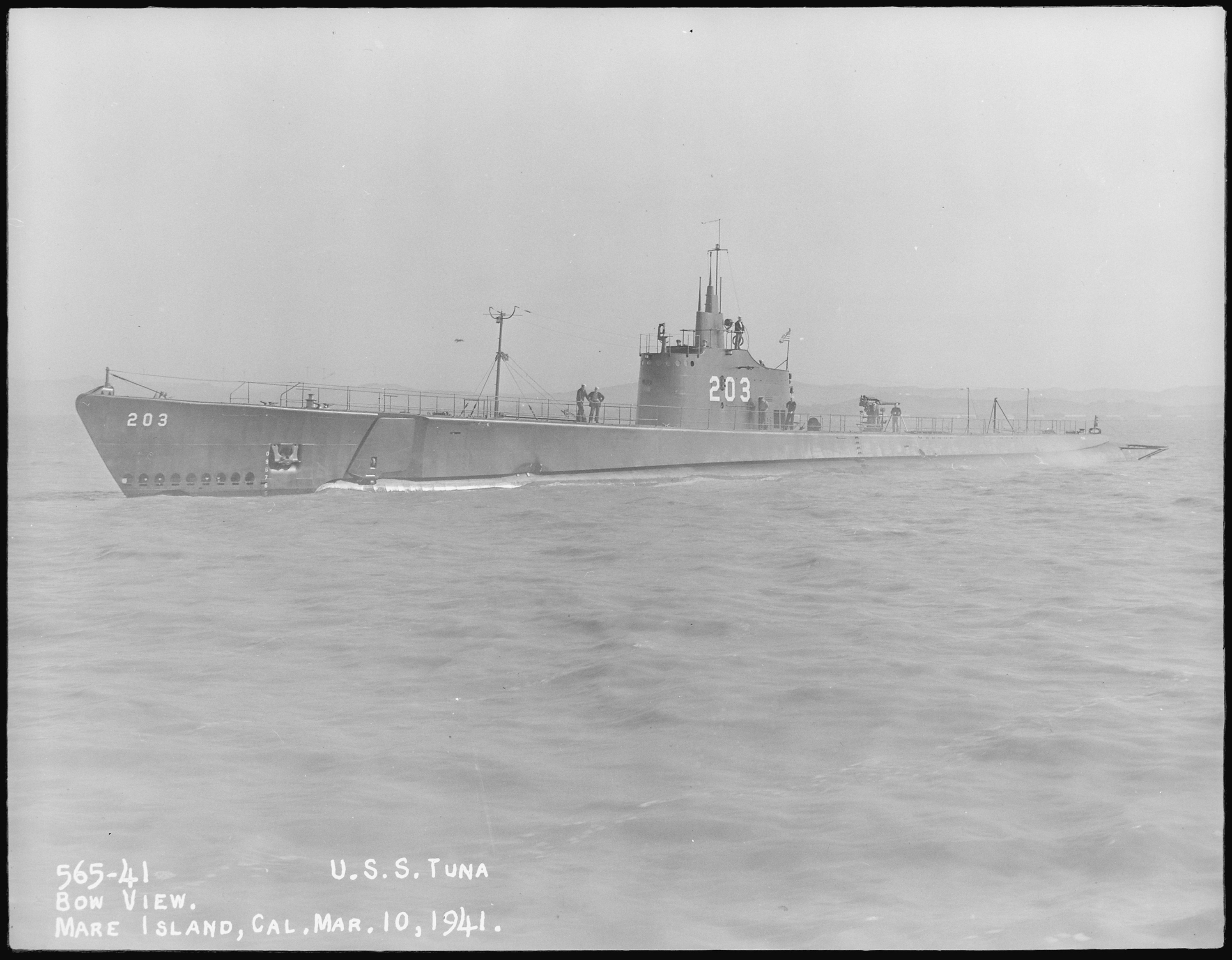 1.06k | Port bow view of the Tuna (SS-203) underway in San Francisco Bay, 10 March 1941. | Record Group 19: Records of the Bureau of Ships, 1940 - 1966 Series: Naval History Photographs, 1883 - 1941 National Archives Identifier: 513041 Local Identifier: 19-N-24094 Photo courtesy of catalog.archives.gov |