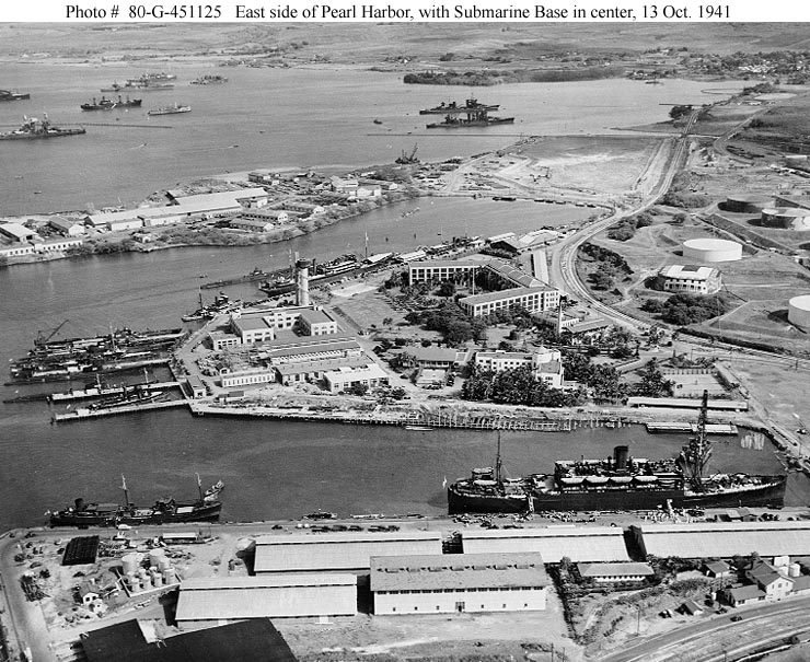 1.07k | Two additional aerial views of the Submarine Base, Pearl Harbor, Oahu, Hawaii, with part of the supply depot beyond and the fuel farm at right, looking north on 13 October 1941. | USN photo # 80-G-651516 & 651518 from NARA, College Park, Maryland, courtesy of Sean Hert. | |