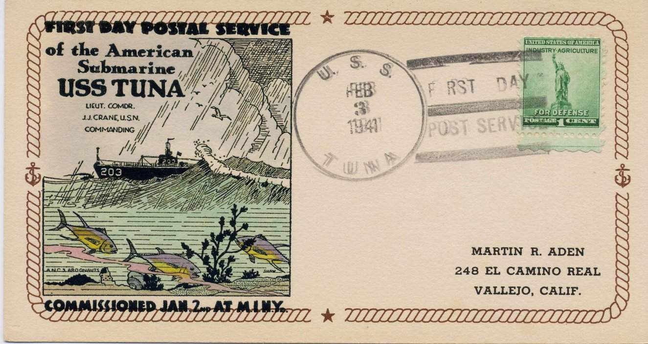 27k | Commemorative post marking the Tuna's (SS-203) first day of postal service on 3 February 1941. | Courtesy of Jack Treutle (of blessed memory). | |