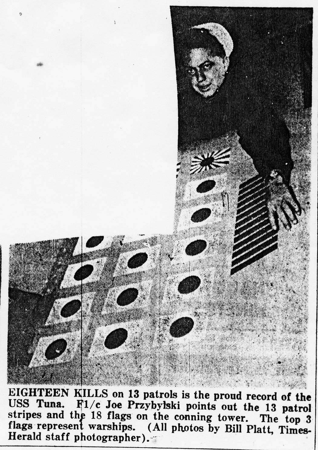 302k | Eighteen kills on 13 patrols is the proud record of the Tuna (SS-203). F1/c Joe Przybylski points out the 13 patrol stripes & the 18 flags on the conning tower. The top 3 flags represent warships. | Photo & texy by Bill Platt, staff photographer, from the 22 September 1945 edition of the Vallejo Times-Herald , courtesy of Darryl L. Baker. | |