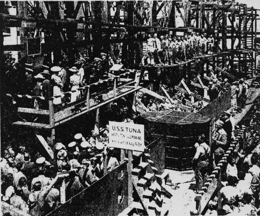 NR | NAVY LAUNCHES ANOTHER SUB With fitting ceremonies, the U. S navy launches another new submarine, the $6,000,000 Tuna (SS-203), at the Vallejo, Cal., navy yards. | Image and text provided by Central Michigan University, Clark Historical Library Photo & text by The Ypsilanti Daily Press. (Ypsilanti, Mich.) 1928-1962, 14 October 1940, Image 14, courtesy of chroniclingamerica.loc.gov. | |