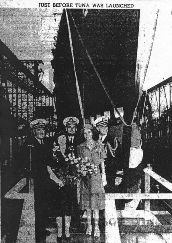 76k | Photo from 3 October 1940 edition of the Vallejo Times Herald picturing the official launching party on 2 October 1940 for the Tuna (SS-203) at Mare Island. From left to right: RADM David W. Bagley, Yard Commandant; Capt F. G. Crisp, Yard Manager; CDR L. P. Padgett, Jr., Aide to the Commandant and Mrs. Wilhelm Friedell, Sponsor; and her daughter Miss Luice Friedell. | Photo courtesy of Darryl L. Baker. | |