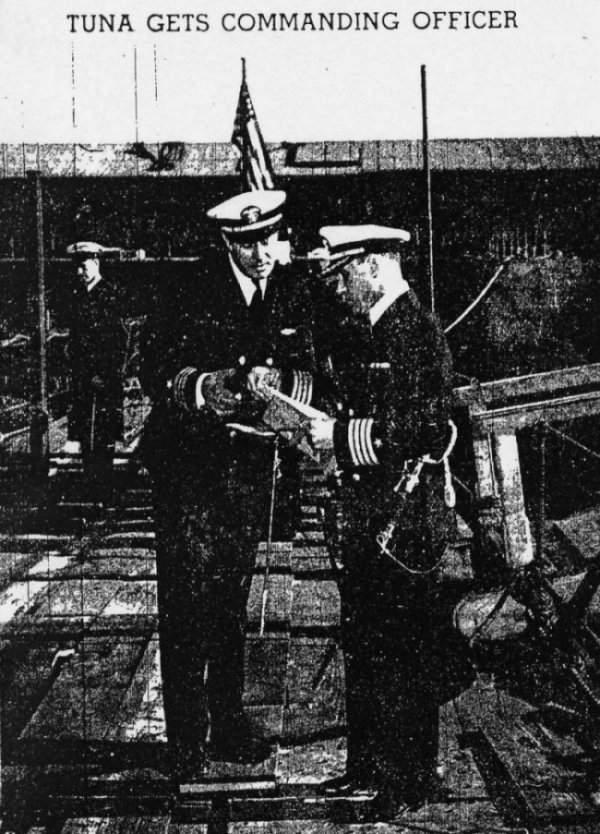 77k | Photo from 3 January 1941 edition of the Vallejo Times Herald picturing Capt A. D. Denney, right, Captain of the Yard; turning over the Tuna (SS-203) to her first Commanding Officer, LCDR John J. Crane at her commissioning at Mare Island on 2 January 1941. | Photo courtesy of Darryl L. Baker. | |