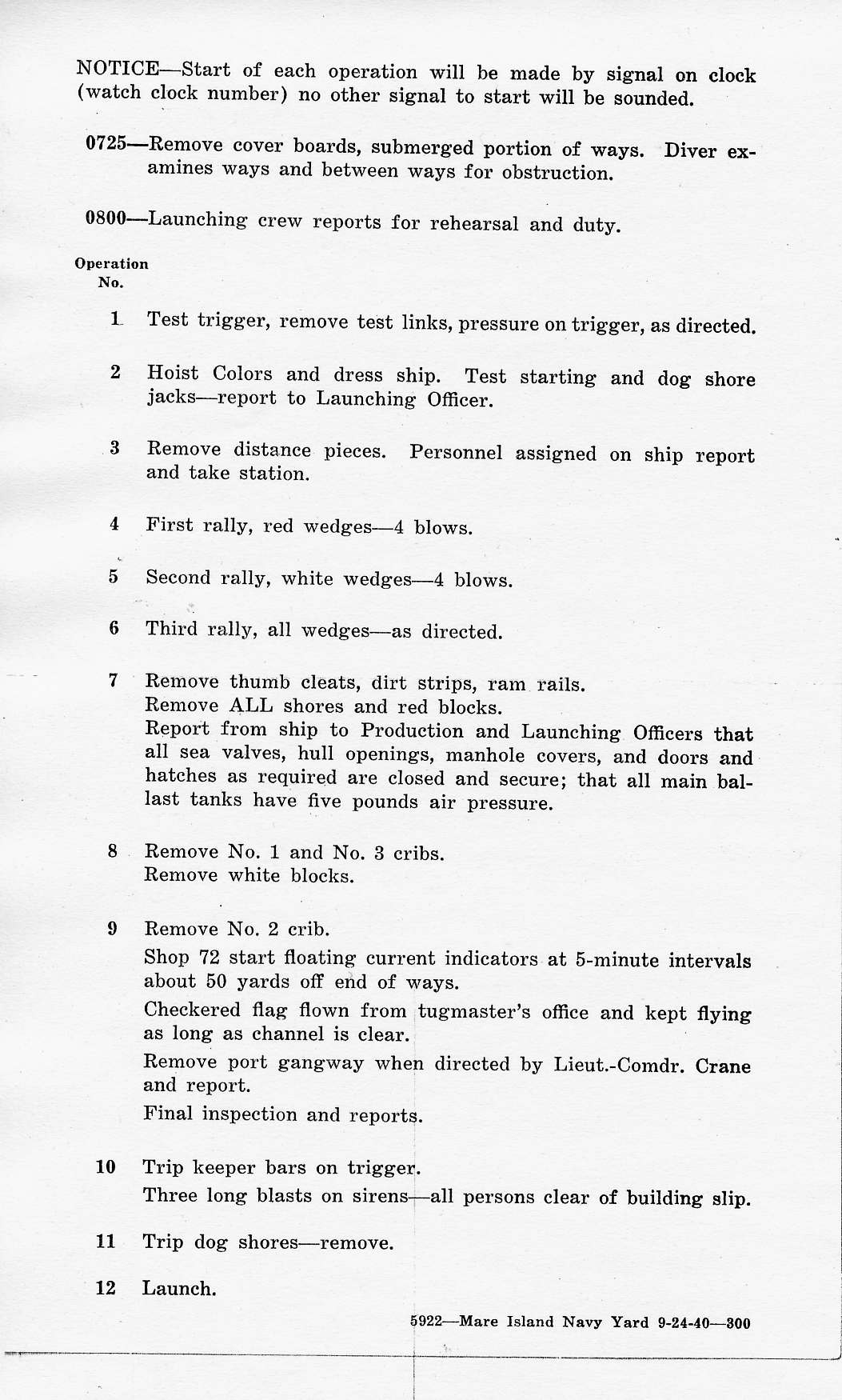 190k | Inside pages of the launch Detailed Operating Schedule for Launching of the Tuna (SS-203) on 2 October 1940. | Photo courtesy of The Vallejo Naval & Historical Museum, submitted by Darryl L. Baker. | |