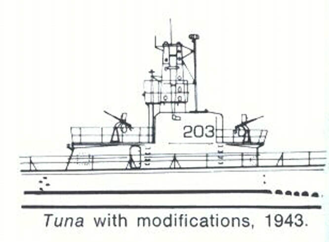 48k | This drawing does not accurately depict the Tuna (SS-203) at any time in her career. It is similar to her final configuration in 1945, but the periscope shears are too large in diameter, and it does not show the "covered wagon" ribs that are typical of the Mod 4 configuration that she carried in 1945. See below photo for comparision. | Text i.d. courtesy of David Johnston (USN, retired) Photo courtesy of Scott Koen & ussnewyork.com. |