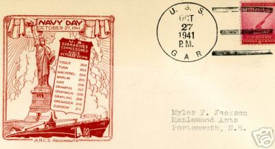 ![]() | 20k | Commemorative postal cover marking Navy Day, 27 October 1941 and the following submarines commissioned since the previous year: Trout (SS-202), Tuna (SS-203), Mackerel (SS-204), Marlin (SS-205), Gar (SS-206), Grampus (SS-207), Grayback (SS-208), Grayling (SS-209), Grenadier (SS-210) & Gudgeon(SS-211). | Courtesy of Jack Treutle (of blessed memory). | |