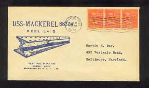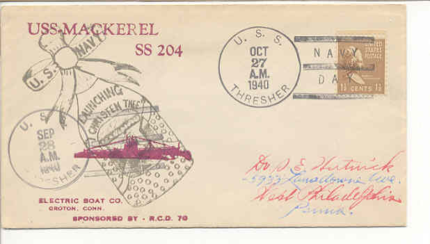 22k | Commemorative post mark on the occasion of the launching of the Mackerel (SS-204), 28 September 1940 at the Electric Boat Co., Groton, CT. | Courtesy of Jack Treutle (of blessed memory). | |