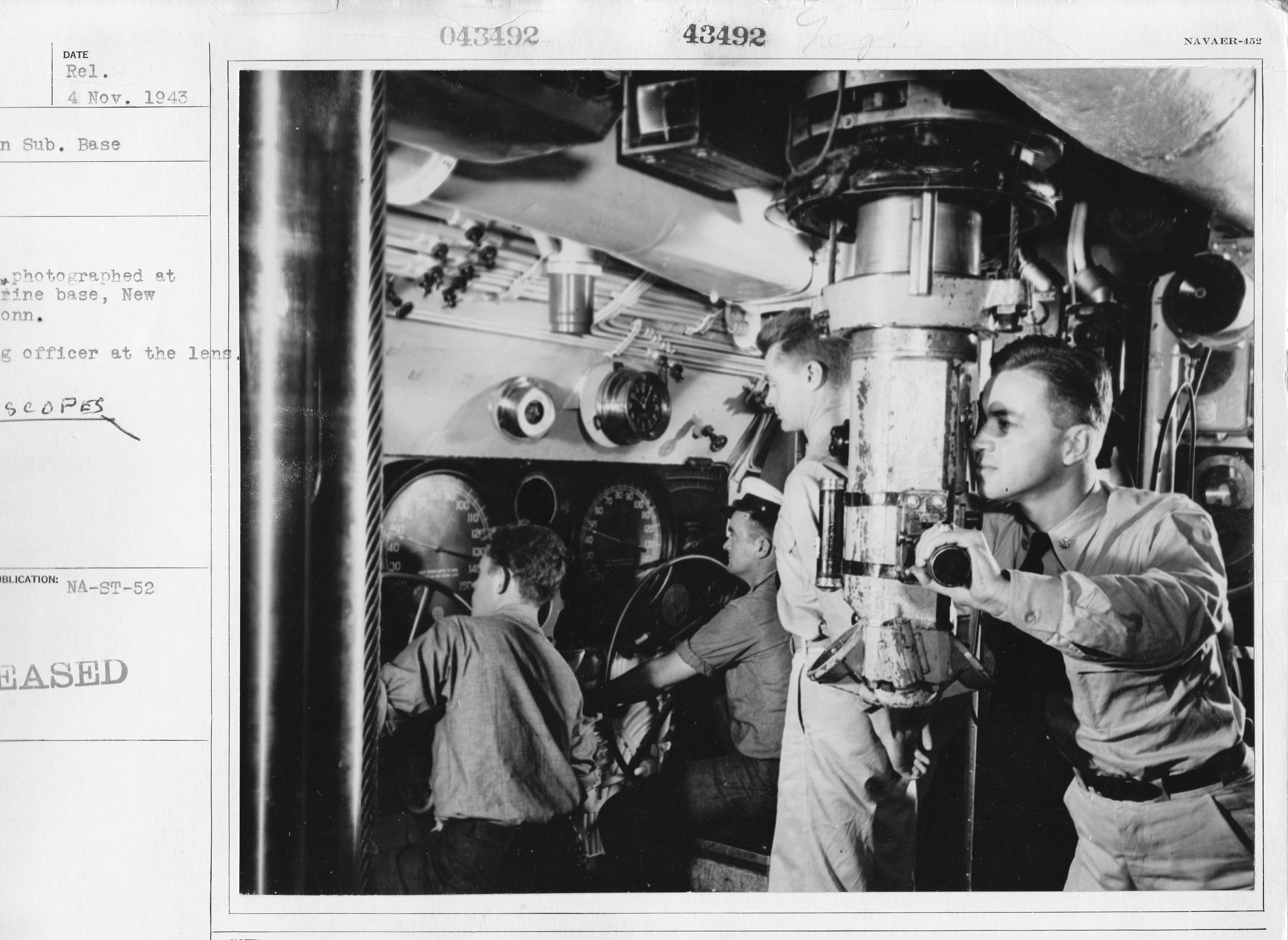 103k | Submarine Commanding Officer sights through a periscope in the submarine's control room, during training exercises at the Submarine Base, New London, Groton, Connecticut, in August 1943. In the background, another officer watches men at the control dials.