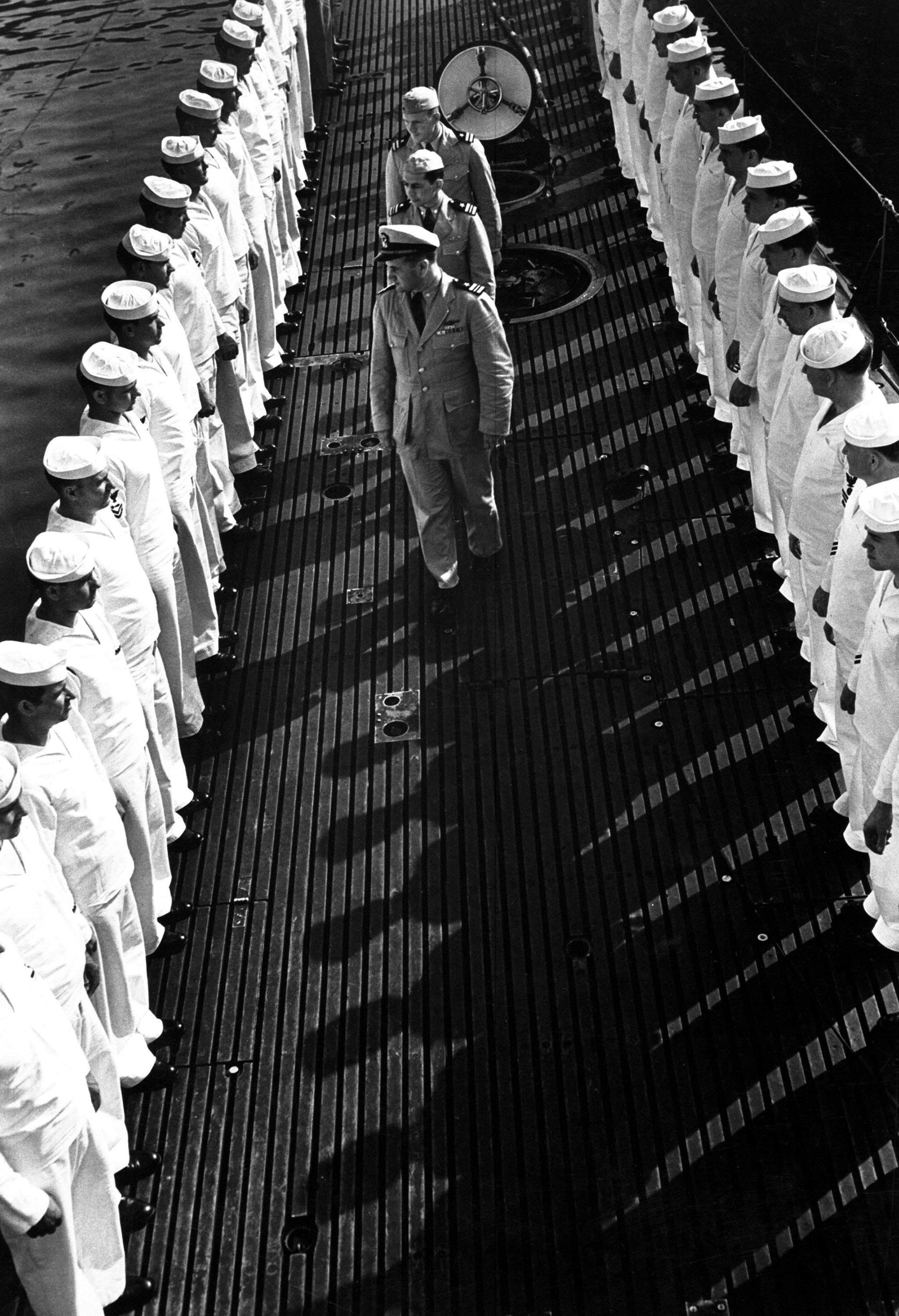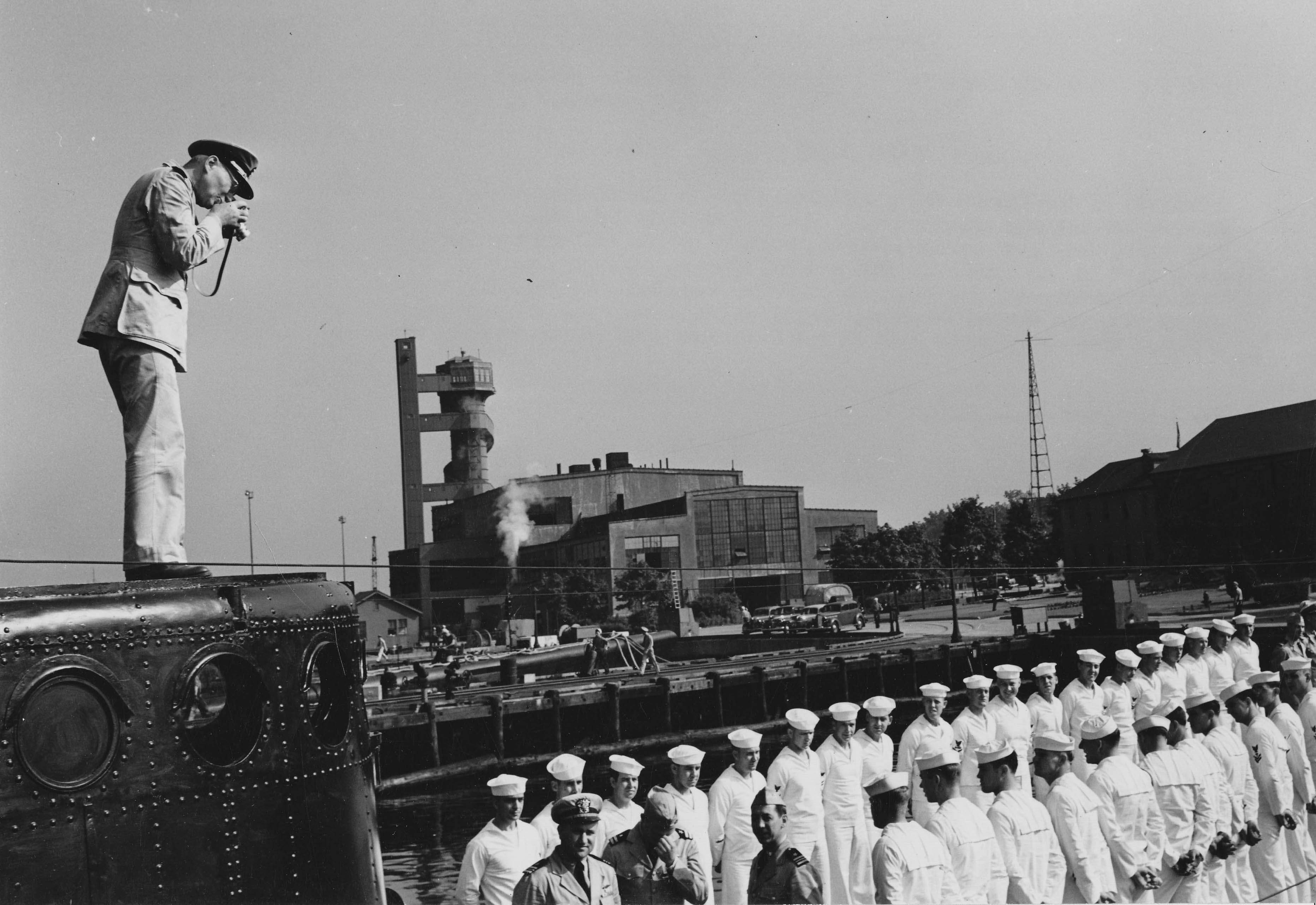 725k | Mackerel's (SS-204) crew line the boat's deck during an inspection at New London submarine base, Conn. August 1943. Regarding the crew, one thing noticeable is that none of them are wearing the Combat Pin. Although it does not appear to be a formal inspection, ie, crew is in ‘undress' whites, the officers, although in dress khakis, might not have worn the Combat Pin, but with ribbons displayed. The ‘command pin' on the leading officer is also not present. One of the differences between the Mackerel & the Marlin (SS-205) is the Marker buoy directly aft of the hatch. On Marlin it is forward to port. Regarding the lack of combat pins by the crew in this photo; the Mackerel was a training boat the entire war. | NARA FILE #: 080-G-468153, photographed by Comdr. Edward J. Steichen. Photo # HD-SN-99-02606, courtesy of dodmedia.osd.mil, Defense Visual Information Center. Photo I.d. & text courtesy of Jim Christley, David Decrevel, John Hart, John Hummel, David Johnston (USN, retired) & Ron Reeves (of blessed memory) | |
