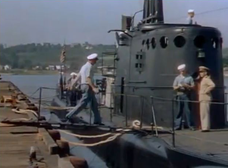 581k | Still photo from the 20th Century Fox 1943 production of Crash Dive starring Tyrone Power and Dana Andrews. This photo shows one of the two boats used during filming of the movie, the Mackerel (SS-204). The outdoor scenes of the movie were filmed during the late summer of 1942 entirely at the Naval Submarine Base New London, CT. Notice Mackerel's overall visual simularity to the fleet boats, even though being considerably smaller. As built, Mackerel's periscope shears were covered in steel plate. This has been removed by the date of this photo, in an attempt to reduce the boat's visual silhouette. Other than this simple expedient, Mackerel's silhouette remained largely unchanged for the rest of her career. Unlike her fleet boat cousins, she was built with the conning tower fairwater cut down aft of the bridge and periscope shears, providing an anti-aircraft gun deck surrounded by an open railing (just visible in this photo). The gun originally installed there was a water-cooled M2 .50 caliber machine gun. | Photo & text courtesy of David Johnston. | |