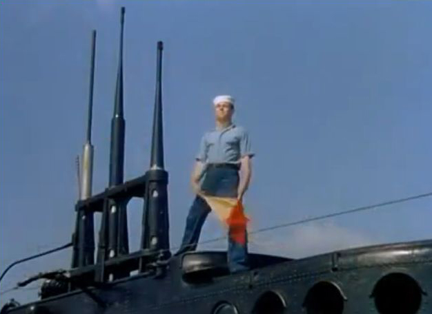 118k | A close up shot (late summer 1942) of the Mackerel's periscope shears, a still from the movie Crash Dive. Both of the Mackerel's scope let into the control room. Her conning tower was very small, not much more than an access trunk to the bridge. The mast aft of the scopes is an communication antenna. This would be replaced by an SD air-search radar mast in December 1942, and an SJ surface search antenna would be added forward of the scopes. | Photo & text courtesy of David Johnston. | |