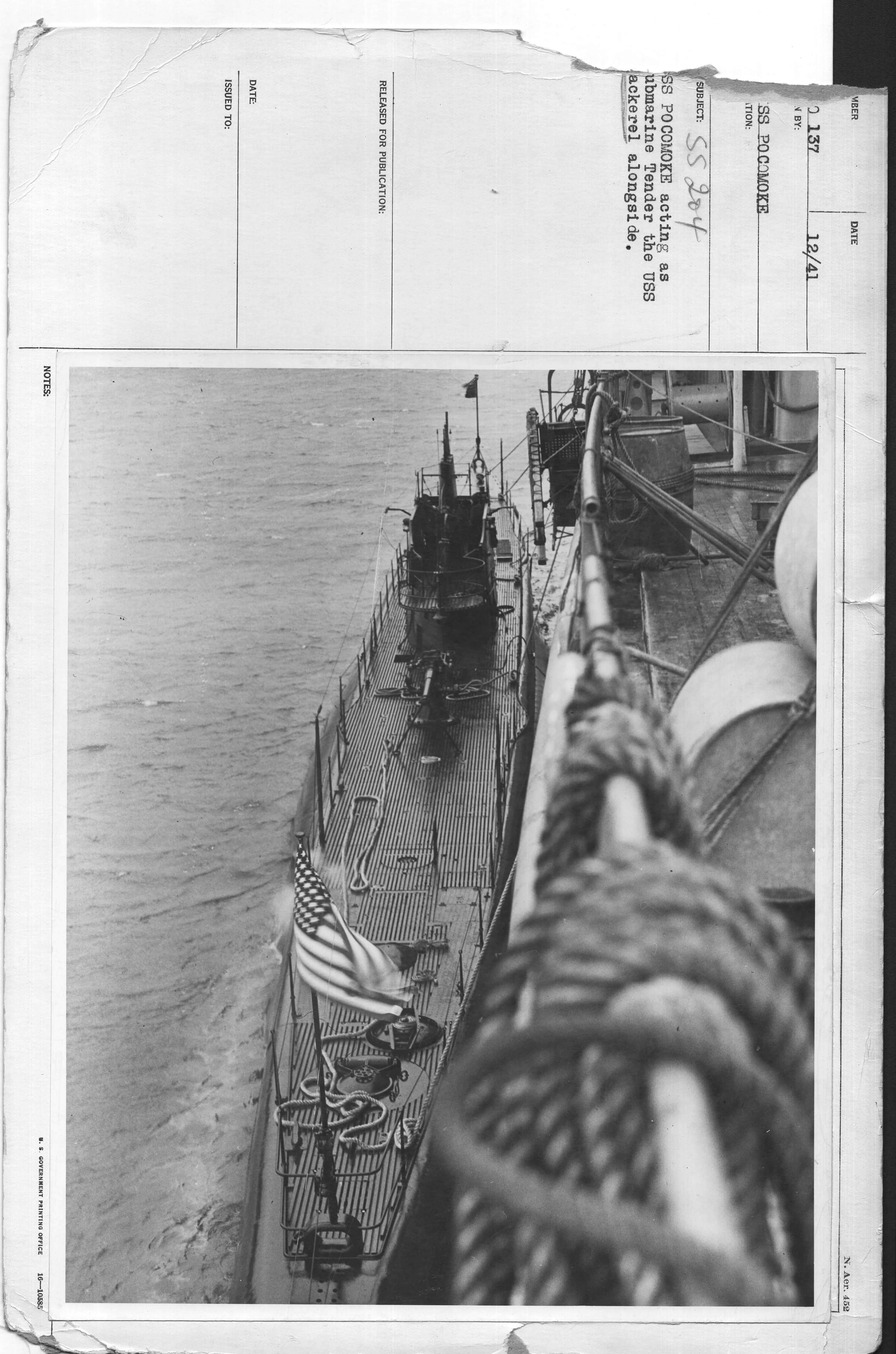 975k | Pocomoke (AV-9) acting as a submarine tender for the Mackerel (SS-204) alongside, December, 1941. | USN photo # 80CF-137, from National Archives and Records Administration (NARA), College Park, Maryland, courtesy of Sean Hert. | |