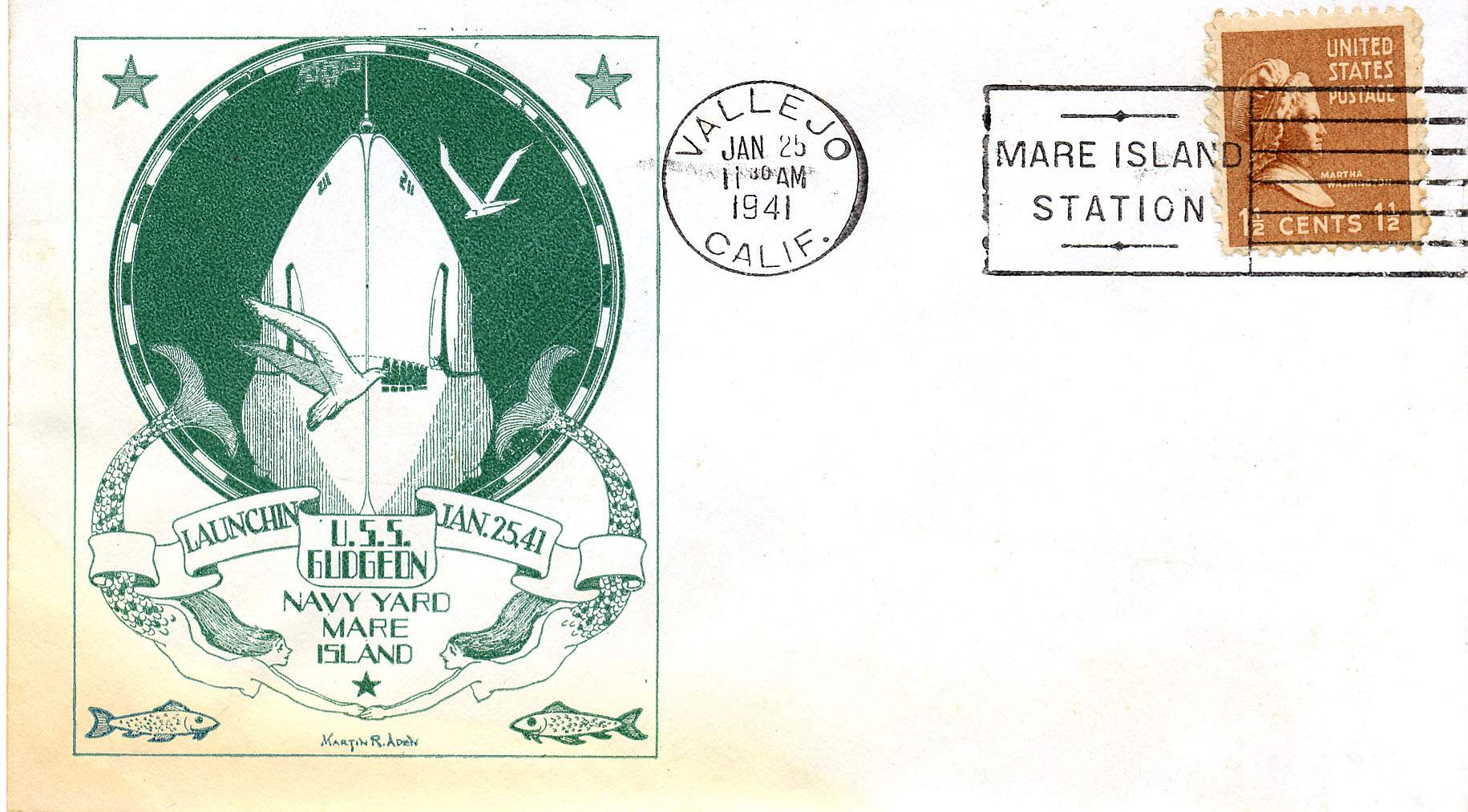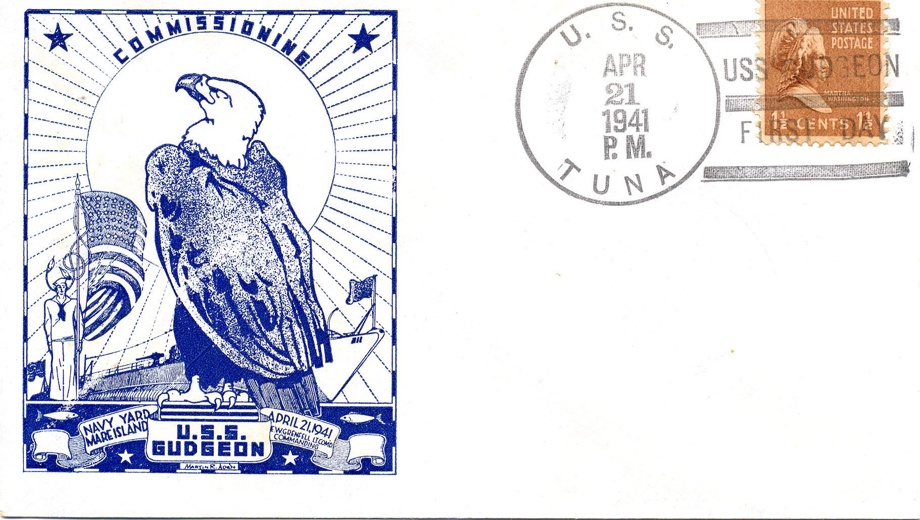 64k | First day postal cover commemorating the commissioning of Gudgeon(SS-211), 21 April 1941. | Courtesy of Darryl L. Baker. | |