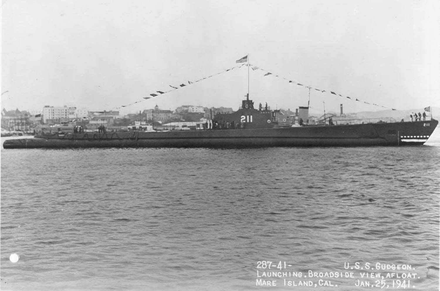 481k | The Gudgeon (SS-211) is waterborne at Mare Island, Cal., 25 January 1941. | Photo courtesy of Scott Koen & ussnewyork.com. | |