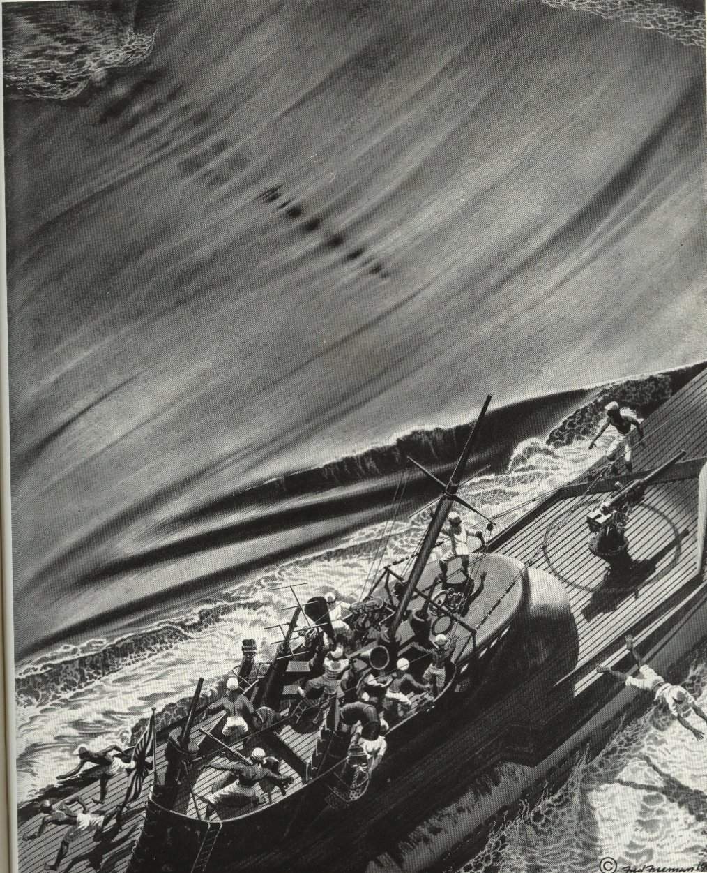 230k | Torpedo! The arrowing wake promises a direct hit. Frantic crewmen of Japanese submarine I-173 see their doom written in froth. Gudgeon (SS-211), (Commander Grenfell ) was victor in this sub vs. sub battle west of Midway. Downed in January 1942, I-173 was the first warship ever sunk by a U.S. submarine. | Drawing by Lt. Cmdr. Fred Freemen, courtesy of Theodore Roscoe, from his book "U.S. Submarine Operations of WW II", published by USNI. | |