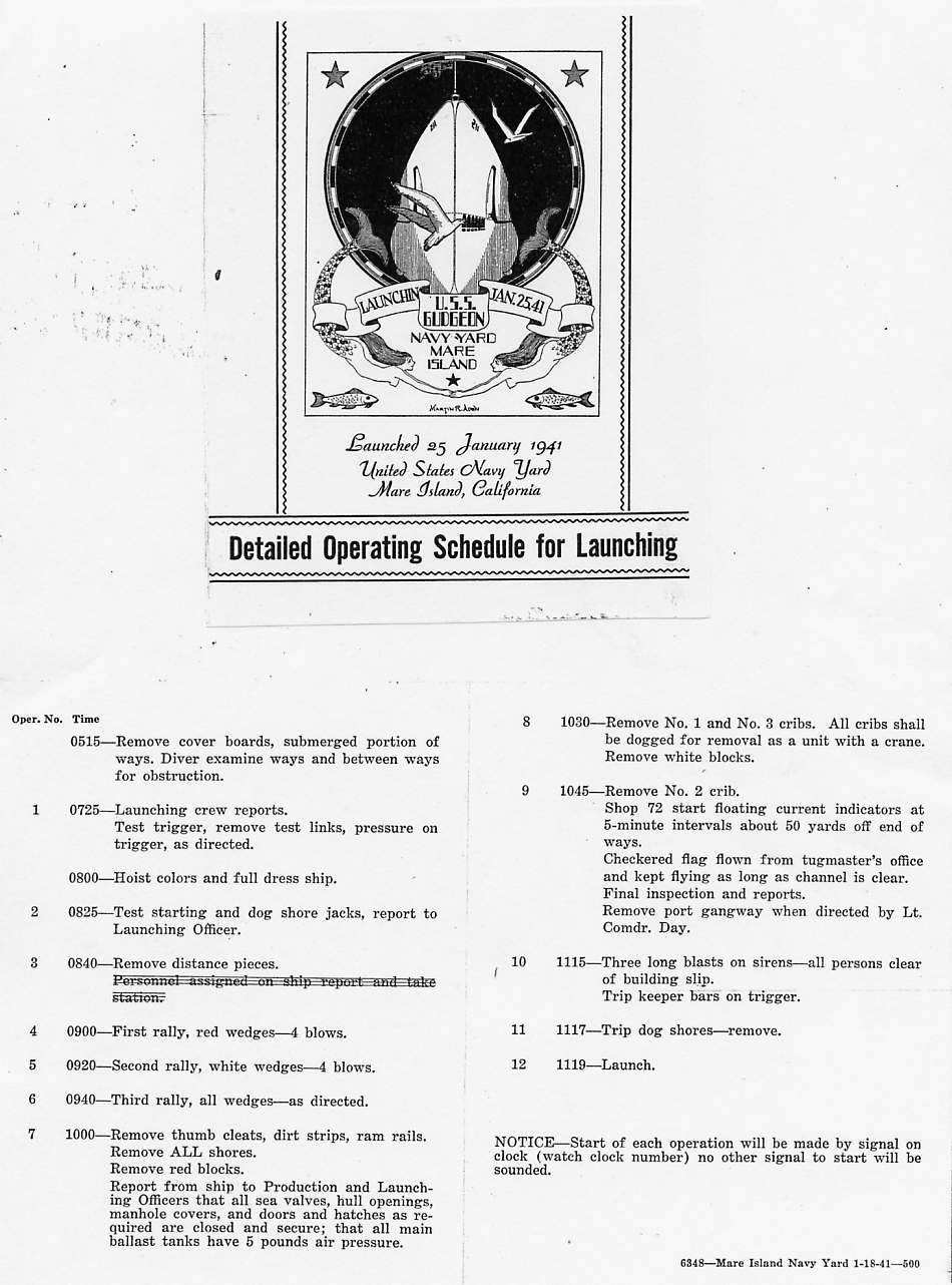 131k | Detailed Operating Schedule for launching of the Gudgeon (SS-211), at Mare Island on 25 January 1941. | USN photo courtesy of Darryl L. Baker. | |