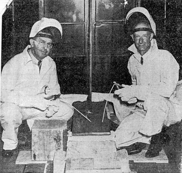 91k | Newsclipping from the 23 November 1939 edition of the Vallejo Times-Herald picturing the Honorary Keel Layers for the Gudgeon (SS-211), at Mare Island on 22 November 1939. From left to right are: Phil Creedon, quarterman (senior supervisor) rigger and George Mercer, electrical engineer in the welding enclosure. | USN photo courtesy of Darryl L. Baker. | |