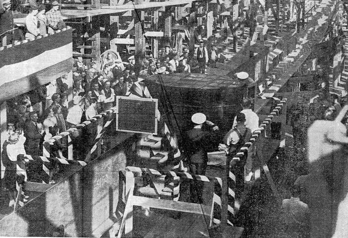 88k | Newsclipping from the 23 November 1939 edition of the Vallejo Times-Herald: CDR A. M. Pitrie salutes while the Star Spangled Banner is played during the keel laying of Gudgeon (SS-211) at Mare Island on 22 November 1939. CDR Pitrie, Shipyard Manager, had just declared "the keel is well and truly laid". Structure in the middle of the photo is a welding enclosure. | USN photo courtesy of Darryl L. Baker. | |