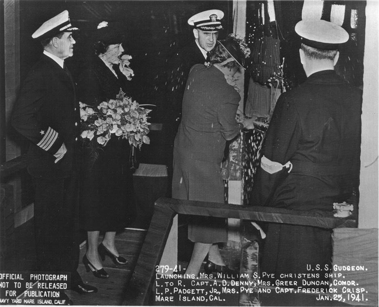 546k | Newsclipping from the 21 April 1941 edition of the Vallejo Times-Herald picturing Mrs. W. S. Pye, Sponsor, christening the Gudgeon (SS-211) on 25 January 1941. Others in the photo are from left to right: Capt. Andrew Denney, Acting Shipyard Commandant; Mrs. Greer Duncan, wife of Capt Greer Duncan and Maid of Honor; CDR Lemuel P. Padget, aide to commandant; Mrs. Pye; and Capt. F. Crisp, yard manager with his back to camera. | Text courtesy of Darryl L. Baker. USN photo courtesy of Mike Ostlund, author of Find 'Em, Chase 'Em, Sink 'Em: The Mysterious Loss of the WWII Submarine USS Gudgeon. | |
