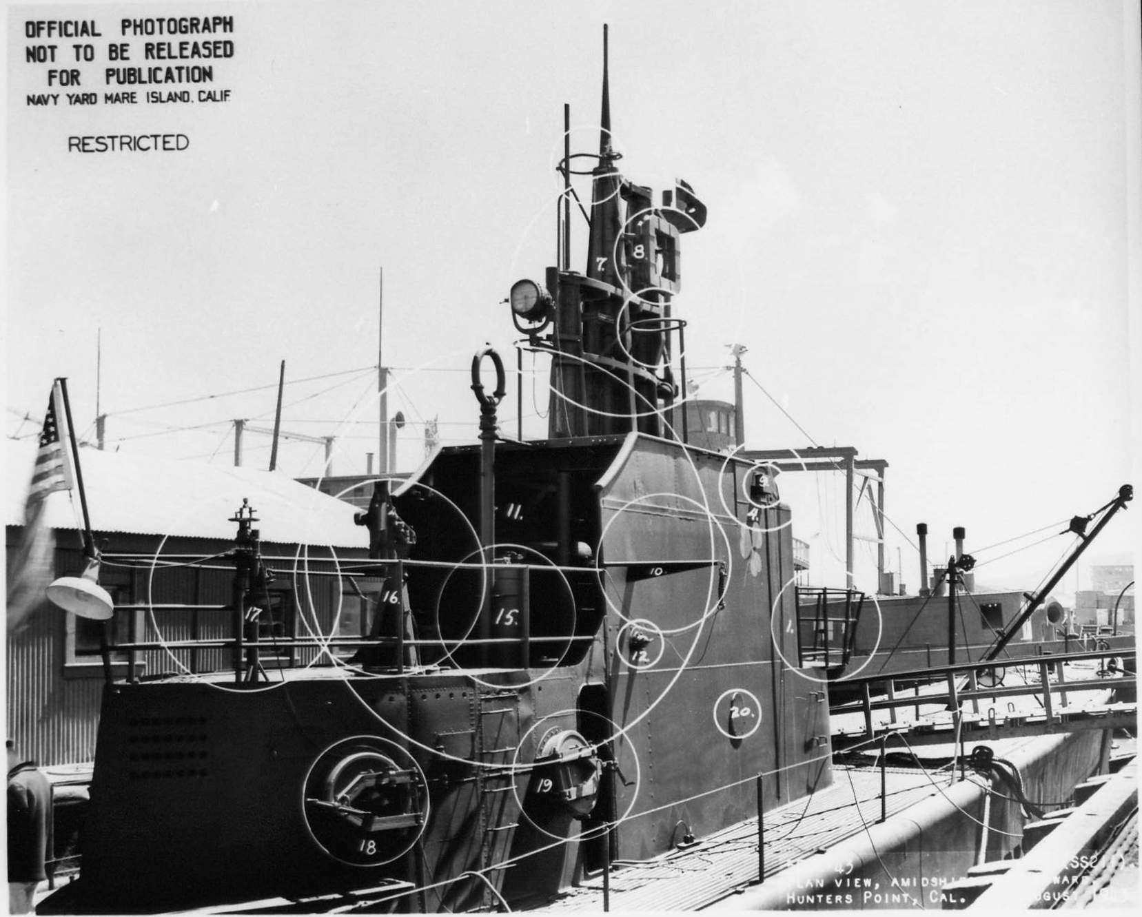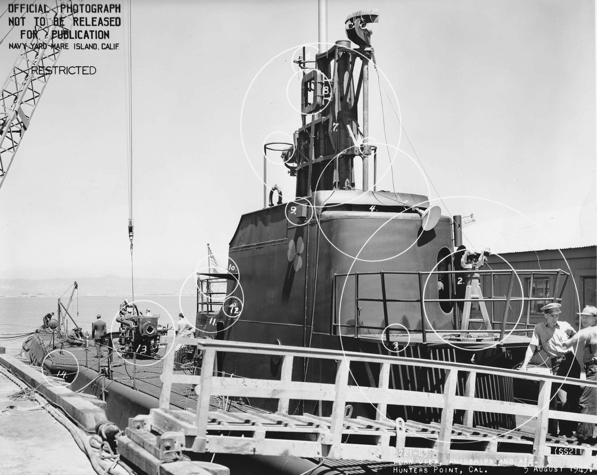 272k | Plan view amidships of Gudgeon (SS-211) at Hunters Point on 5 August 1943. | US National Archives photo # 19LCM bs50789, from NARA, College Park, Maryland, courtesy of Sean Hert. | |