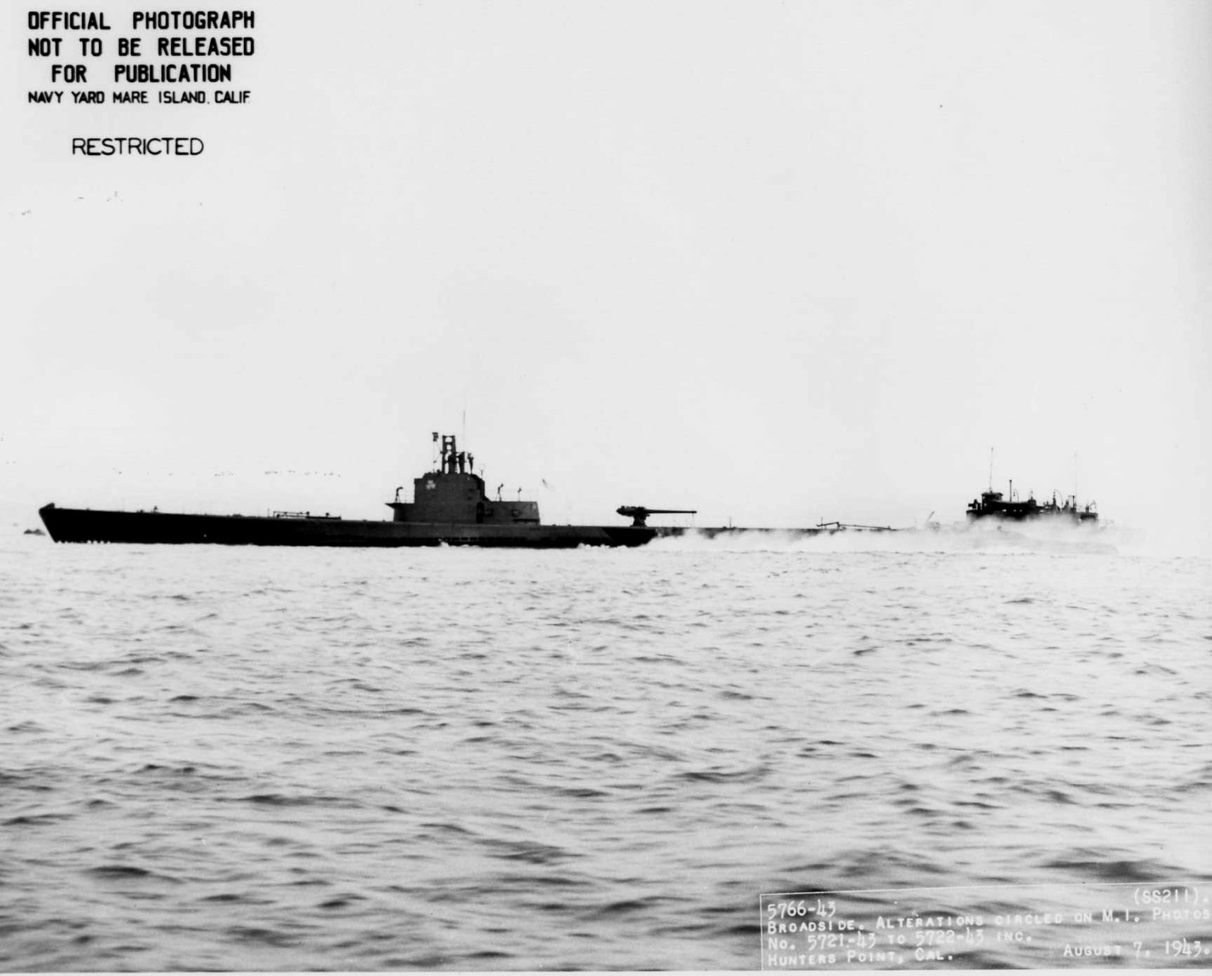 121k | Broadside view of Gudgeon (SS-211) at Hunters Point on 7 August 1943. | USN photo # 5766-43, courtesy of Darryl L. Baker. | |