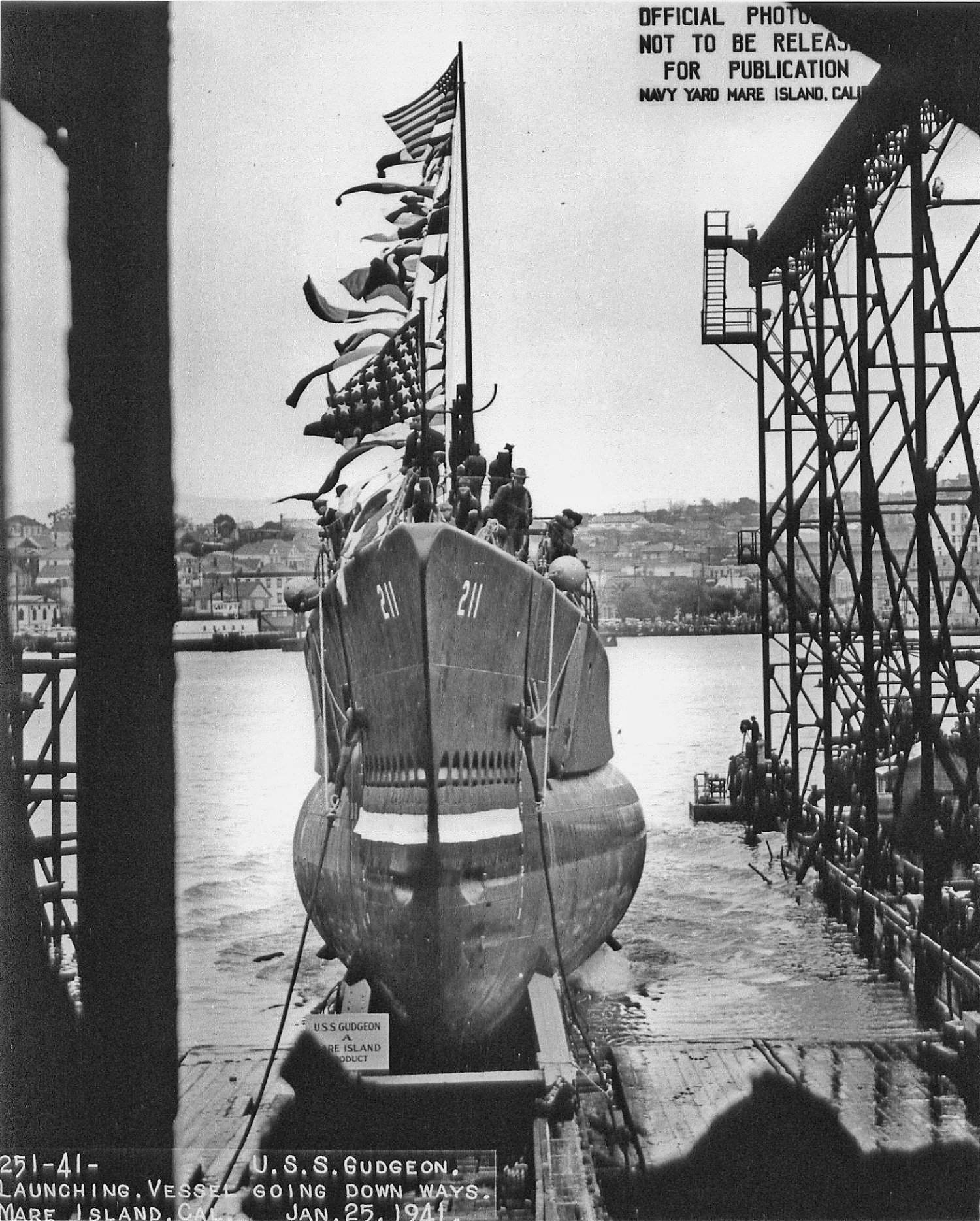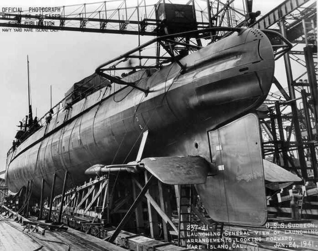 714k | Gudgeon (SS-211) in the Mare Island Channel after her launching at Mare Island on 25 January 1941. Launching cradle is forward of the submarine's bow. | Vallejo Naval & Historical Museum Photo courtesy of Darryl L. Baker. | |