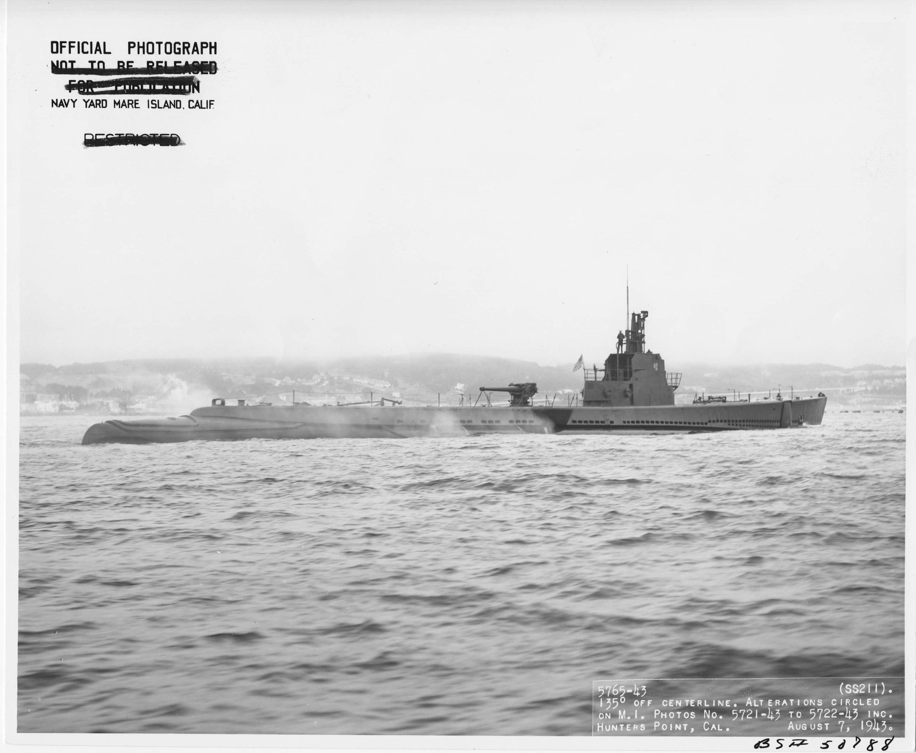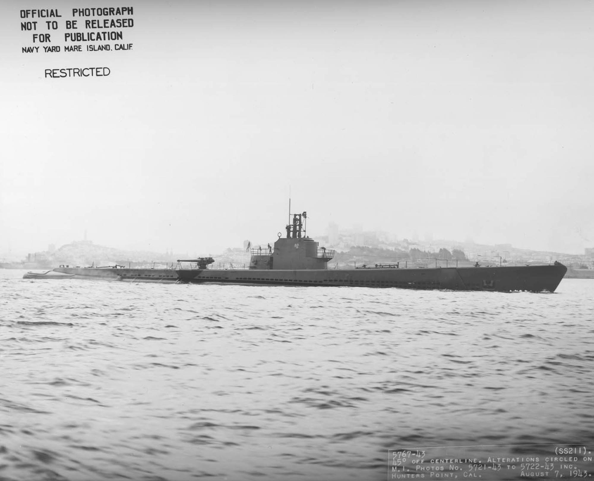 139k | Starboard bow view of the Gudgeon (SS-211) at Hunters Point on 7 August 1943. | Mare Island Navy Yard Ship Files, NARA San Francisco, Photo # 5767-43, courtesy of Tracy White @ Researcher @ Large. | |