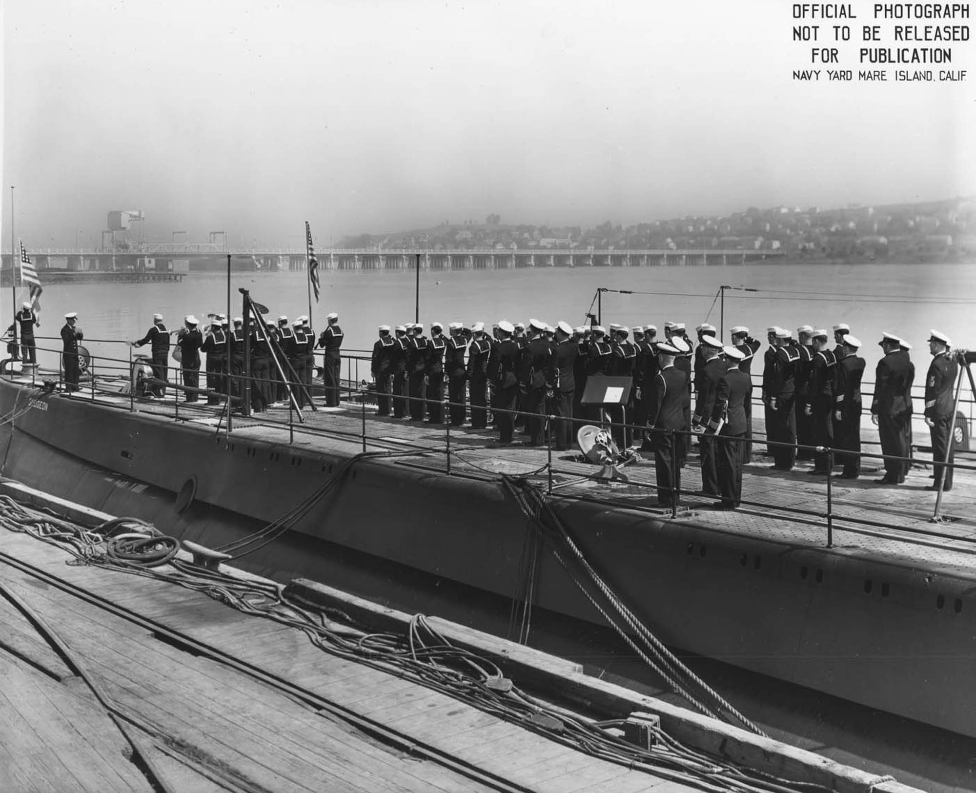 233k | Commissioning of the Gudgeon (SS-211) on 21 April 1941. | Mare Island Navy Yard Ship Files, NARA San Francisco, Photo # 890-41 courtesy of Tracy White @ Researcher @ Large. | |