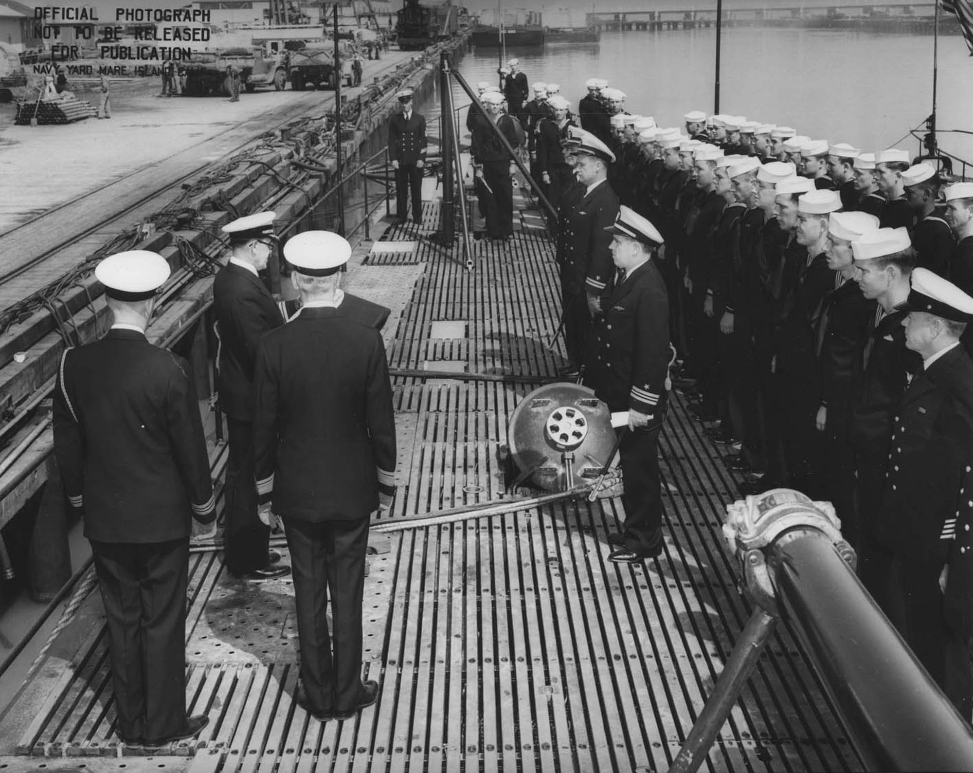 276k | Commissioning of the Gudgeon (SS-211) on 21 April 1941. Lt. Comdr. Elton W. Grenfell, first CO of the boat, is on the right near the hatch, holding his orders. | Mare Island Navy Yard Ship Files, NARA San Francisco, Photo # 896-41 courtesy of Tracy White @ Researcher @ Large. | |