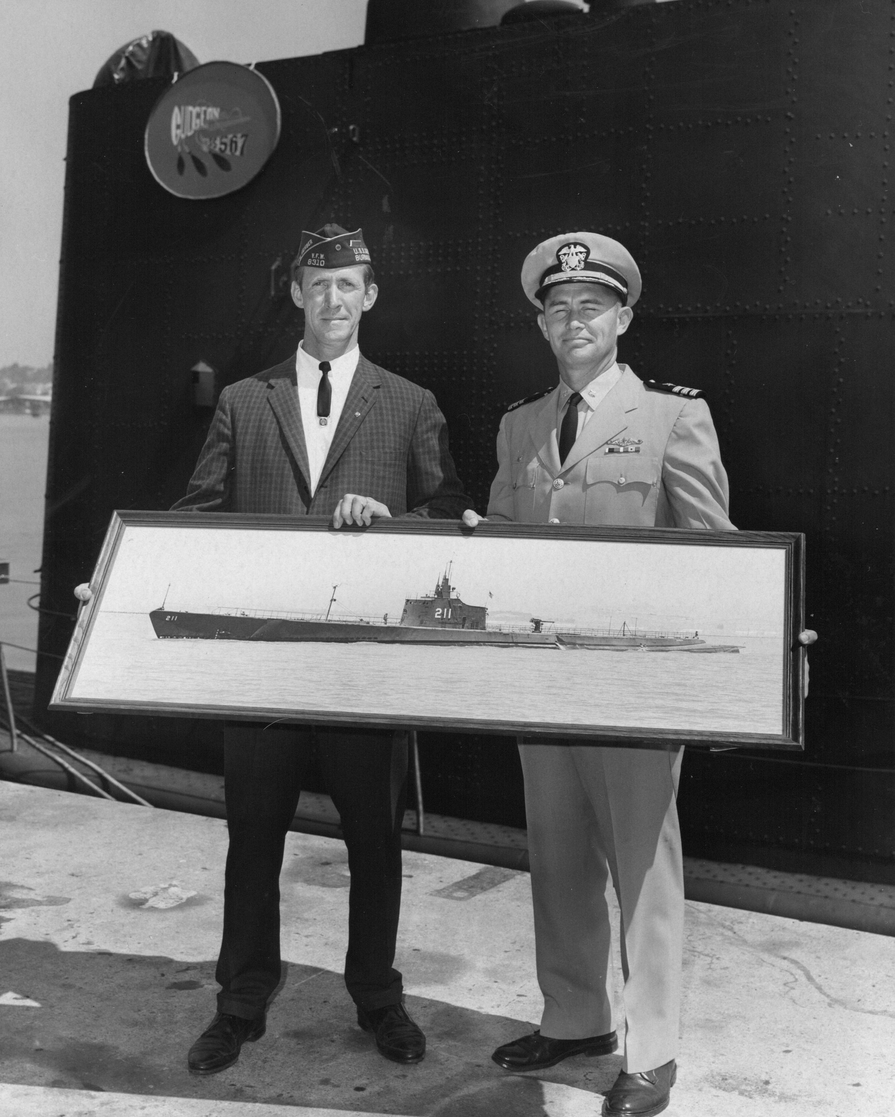 860k | Mr. C. Bud Riffer, left, Commander of VFW post, presents a photo of Gudgeon (SS-211) to CDR P. C. Conrad, Commanding Officer of Gudgeon (SS-567) on 27 August 1967 at Mare Island. | Image and text courtesy of Darryl L. Baker. | |