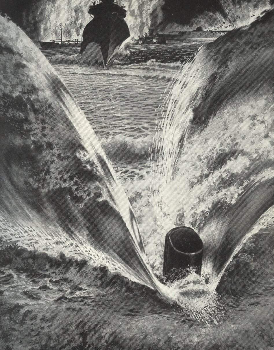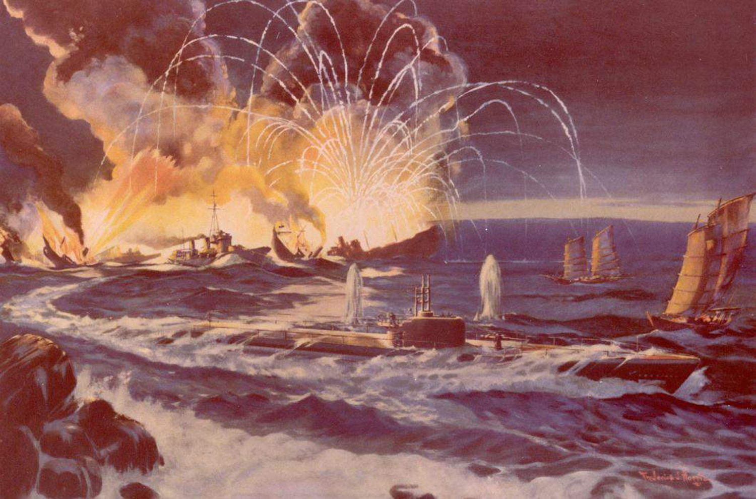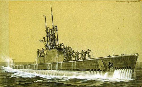 214k | "Bone in teeth, a Jap DD pursues Barb (SS-220) whose periscope is seen going under on the get-away. The submarine, commanded by Eugene B. Fluckey, has just torpoded a tanker and the escort carrier Unyo on the 15th of September, 1944." | Drawing by Lt. Cmdr. Fred Freemen, courtesy of Theodore Roscoe, from his book "U.S. Submarine Operations of WW II", published by USNI. | ||