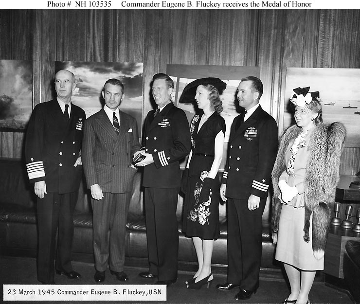 99k | Commander Eugene B. Fluckey, USN (third from left)wearing the Medal of Honor after its presentation by Secretary of the Navy James Forrestal (second from left) in ceremonies at the Navy Department, 23 March 1945. Fleet Admiral Ernest J. King is at left. Mrs. E.B. (Marjory) Fluckey is third from right, standing next to her husband. At right are Commander and Mrs. Roy M. Davenport, USN. Cdr. Davenport received the Navy Cross at this time. | Official USN photo # NH 103535 from the collections of the Naval Historical Center & submitted by Bill Gonyo. | ||