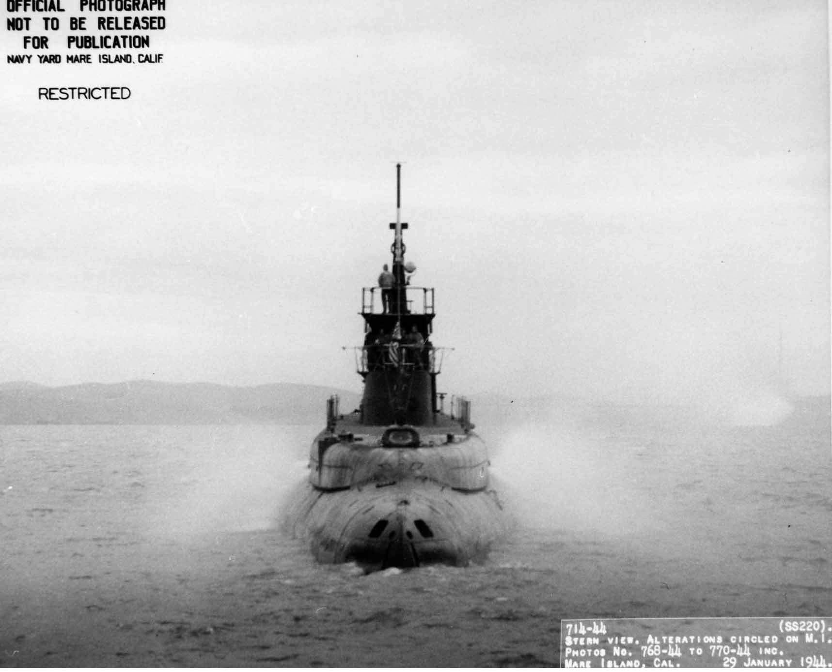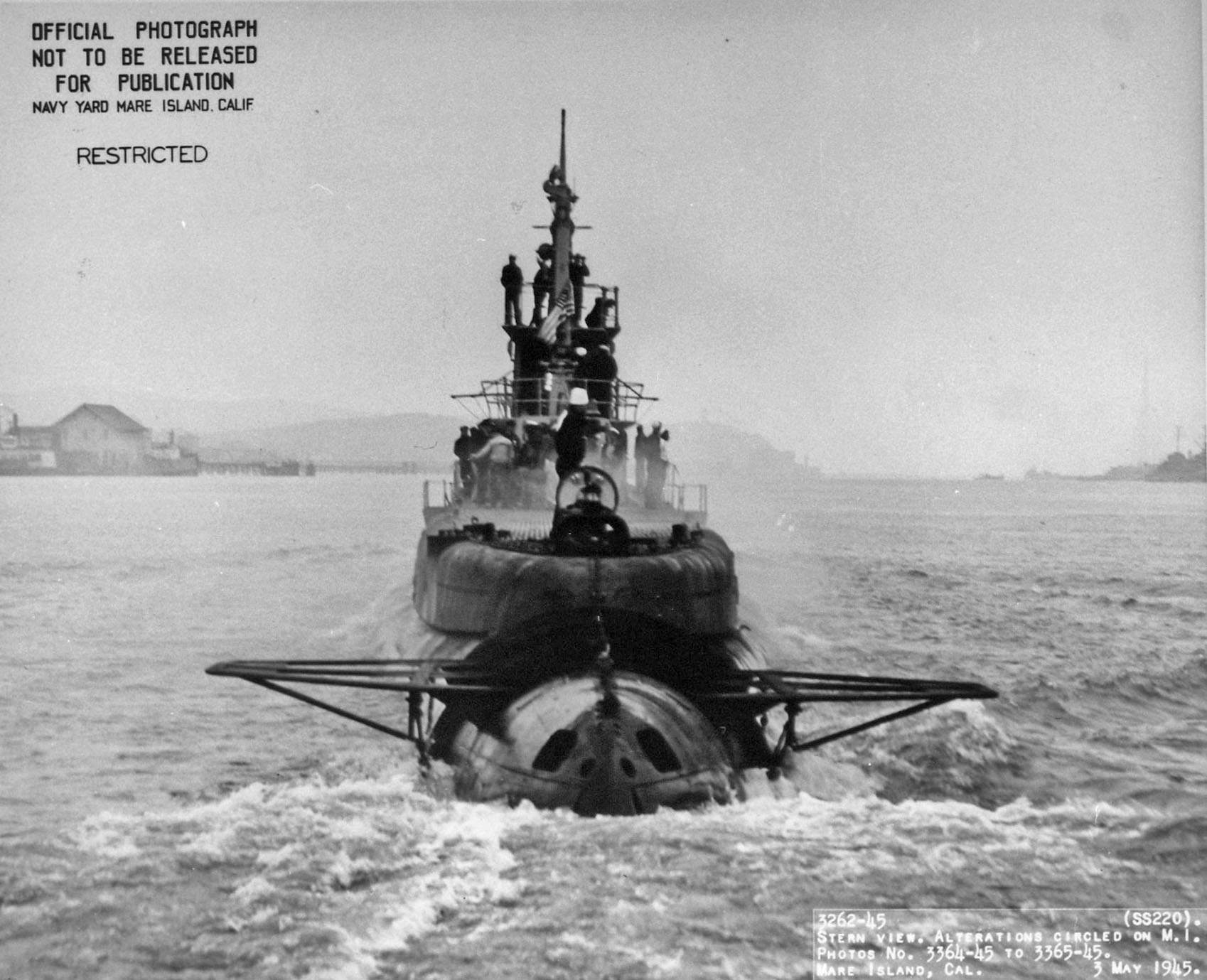 230k | Stern view of Barb (SS-220) departing Mare Island on 3 May 1945. | USN photo # 3262-45, courtesy of Darryl L. Baker. | ||