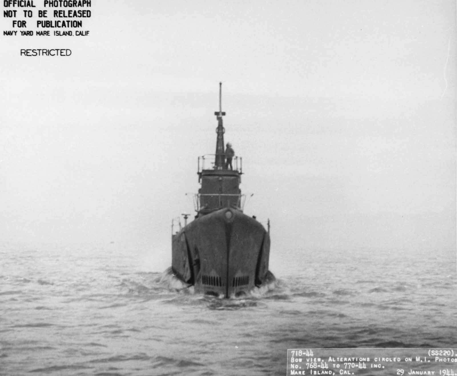 78k | Bow on view of the Barb (SS-220) off Mare Island on 29 January 1944. | USN photo # 718-44, courtesy of Darryl L. Baker. | ||