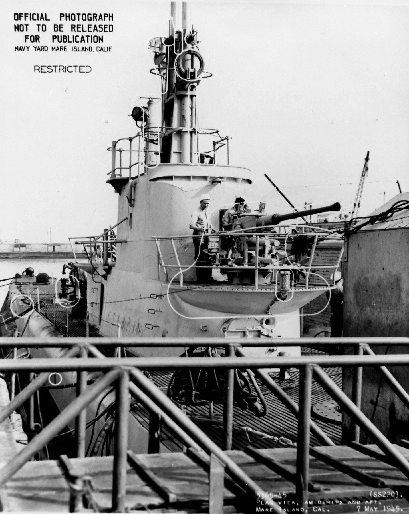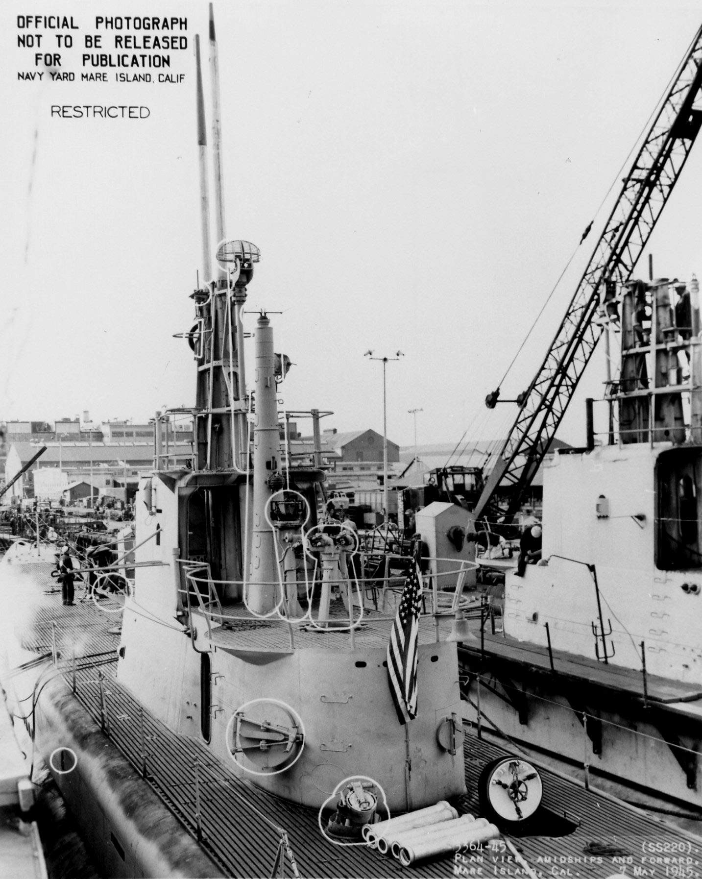 284k | After plan view of Barb's (SS-220) conning tower at Mare Island on 7 May 1945. Sunfish (SS-281) is inboard of Barb. | USN photo # 3364-45, courtesy of Darryl L. Baker. | ||