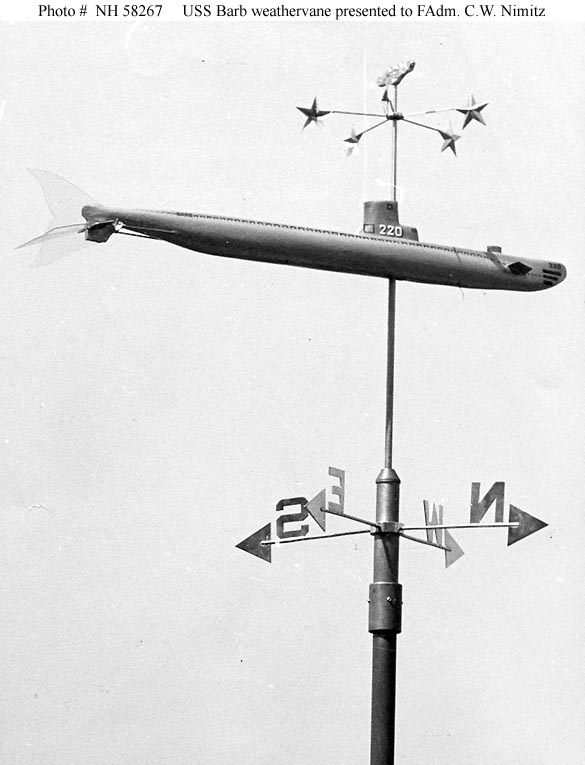 55k | Barb's (SS-220) weathervane. Presented to Fleet Admiral Chester W. Nimitz by his former aide, Rear Admiral Eugene B. Fluckey, USN, circa the later 1950s or early 1960s. Fluckey had commanded the submarine during World War II. The weathervane features submariners' "dolphins" at its top, with the five stars of a Fleet Admiral immediately below, and a model of Barb as she appeared following her 1954 conversion to "GUPPY" configuration. It was erected in Nimitz' garden at 728 Santa Barbara Road, Berkeley, California. | USNHC photograph # NH 58267. Collection of Fleet Admiral Chester W. Nimitz. | ||