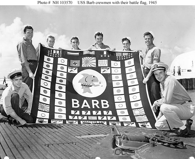 116k | Members of the Barb's (SS-220) demolition squad pose with her battle flag at the conclusion of her 12th war patrol. Taken at Pearl Harbor, August 1945. During the night of 22-23 July 1945 these men went ashore at Karafuto, Japan, and planted an explosive charge that subsequently wrecked a train. They are (from left to right): Chief Gunners Mate Paul G. Saunders, USN; Electricians Mate 3rd Class Billy R. Hatfield, USNR; Signalman 2nd Class Francis N. Sevei, USNR; Ships Cook 1st Class Lawrence W. Newland, USN; Torpedomans Mate 3rd Class Edward W. Klingesmith, USNR; Motor Machinists Mate 2nd Class James E. Richard, USN; Motor Machinists Mate 1st Class John Markuson, USN; and Lieutenant William M. Walker, USNR. This raid is represented by the train symbol in the middle bottom of the battle flag. | Official USN photo # NH 103570, from the collections of the Naval Historical Center. | ||