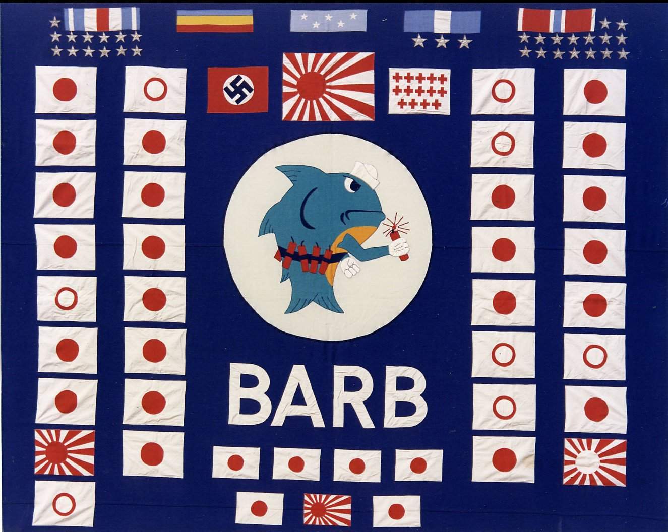 297k | Barb's (SS-220) Battle flag depicting her accomplishment after her 11th war patrol in early 1945. Photo likely taken at the shipyard flag loft. The flag loft did a lot work on submarine battle flags during the war. | USN photo courtesy of Darryl L. Baker. | ||