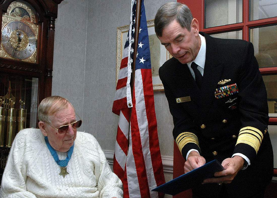 163k | Retired Medal of Honor recipient Rear Adm. Eugene Fluckey receives recognition from Vice Adm. Charles Munns, Commander, Naval Submarine Forces, at the Arbor Nursing Home in Annapolis, Md. on 27 November 2006. Fluckey received the Medal of Honor for gallantry as commanding officer of Barb (SS-220) in 1944. | USN photo # N-5215E-002 by Mass Communication Specialist Seaman Apprentice Matthew A. Ebarb, courtesy of navy.mil. | ||